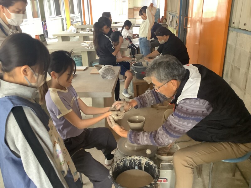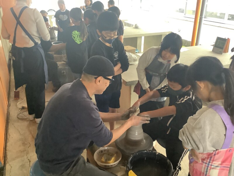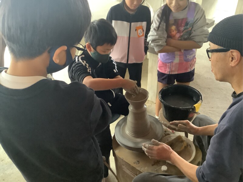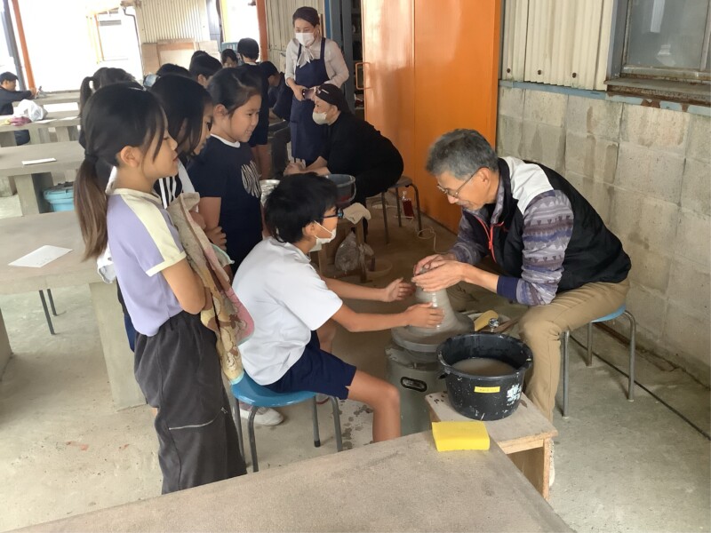 10月 30 2025 伝統工芸士さんによる茶碗づくり(4年生) 4年生がろくろを使って自分のご飯茶碗をつくる体験をしました。共栄校区にお住いの陶芸家若尾誠さん他2名の陶芸家さんのご指導をうけ、実際に自分でろくろを使って茶碗をつくります。3台のろくろを使って順番に丁寧に指導をしてもらいながら一人ずつ作っていきました。子どもたちは緊張しながらも、陶芸家の先生の指示をきいて全員がそれぞれのこだわりのあるご飯茶碗をつくることができました。この茶碗に次は絵をつけて、窯で焼いてもらって完成となります。出来上がりはもう少し先になりますが、とっても楽しみです。