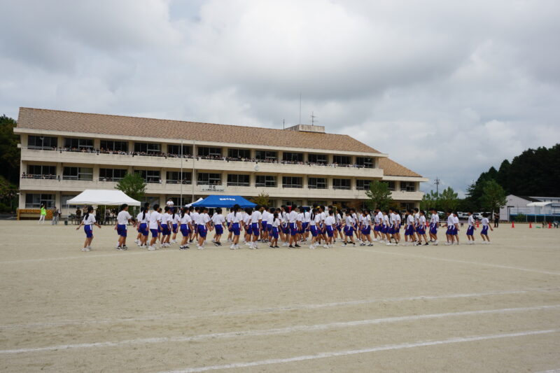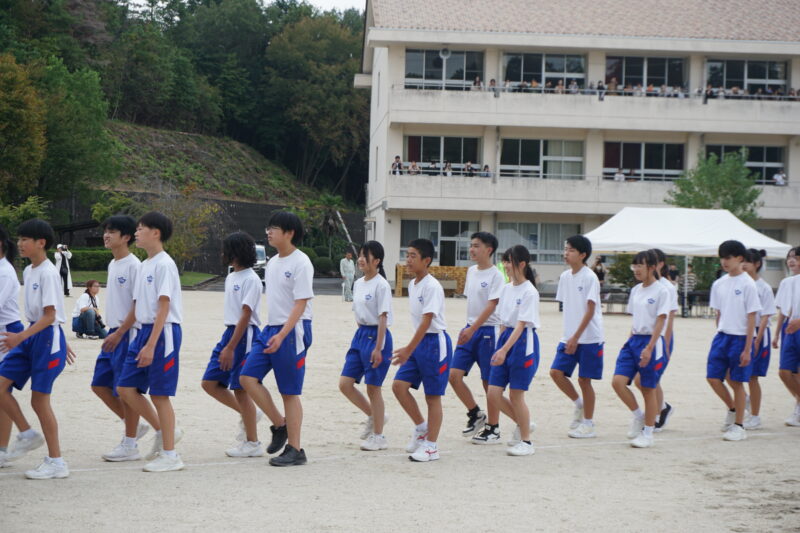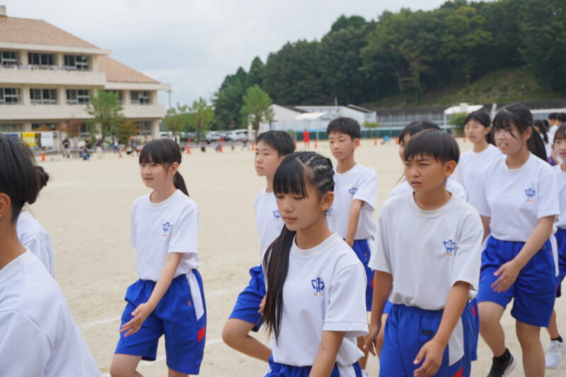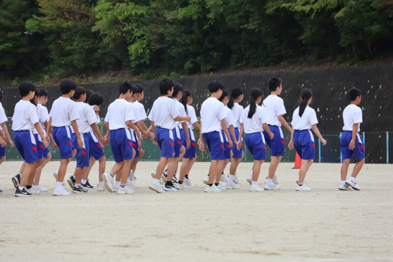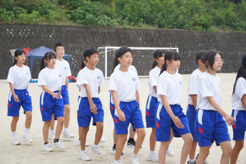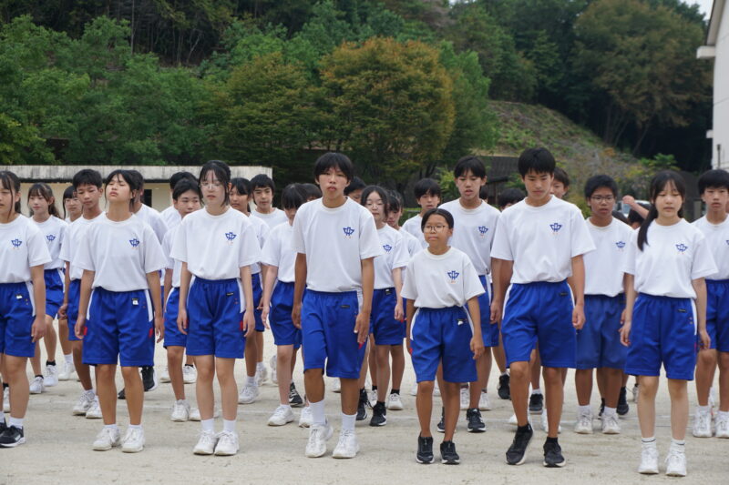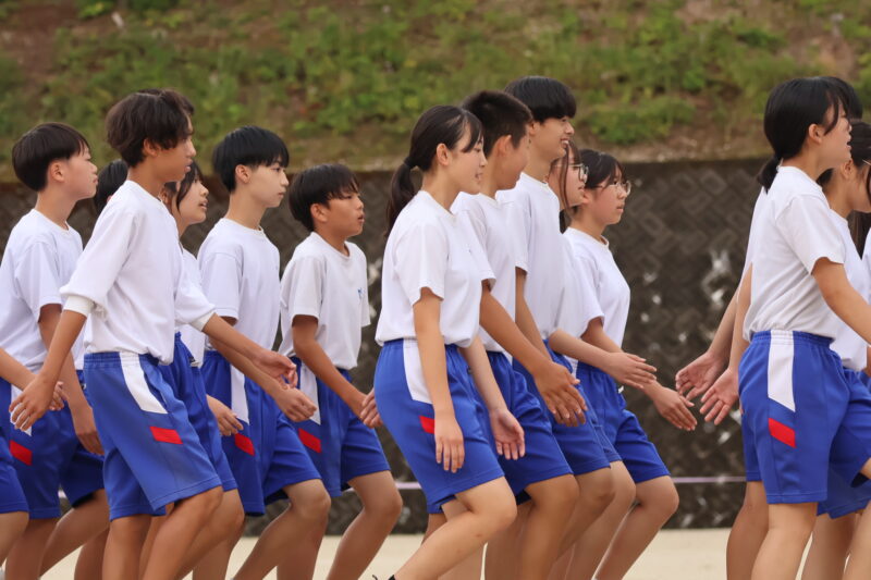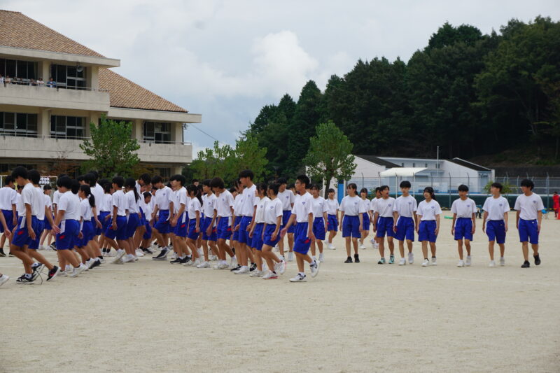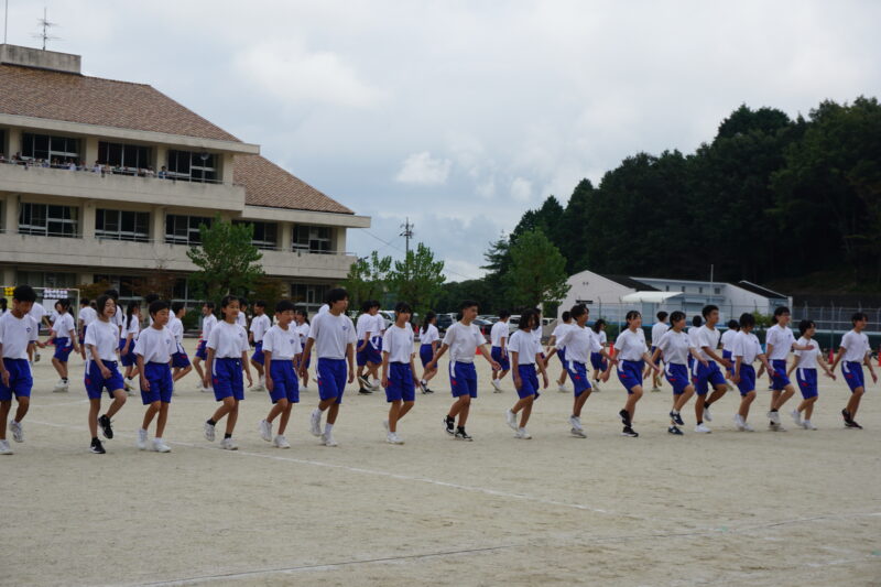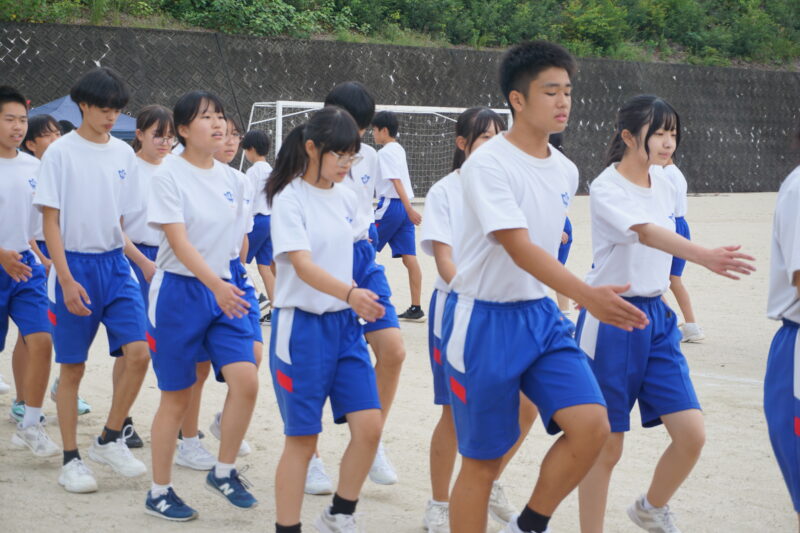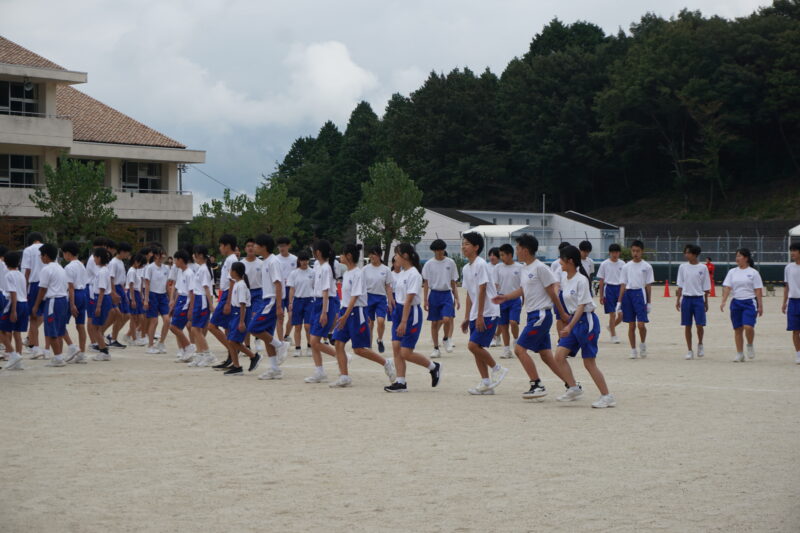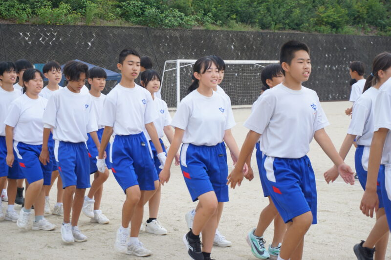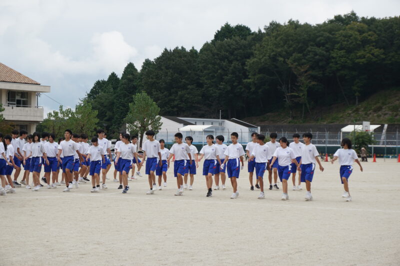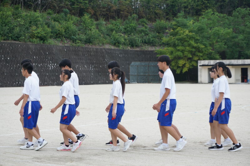 体育の時間に学年ごとに行った集団行動を、全校で合わせてみようと練習をしました。全校で練習した時間は、3時間ほど。それで、ここまで仕上げた生徒たち。