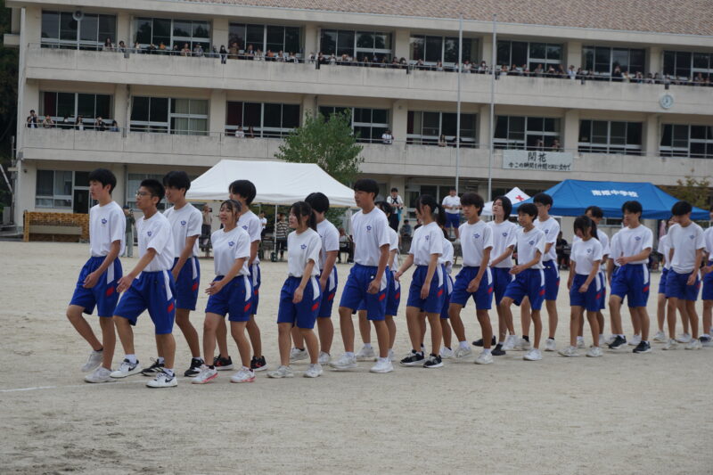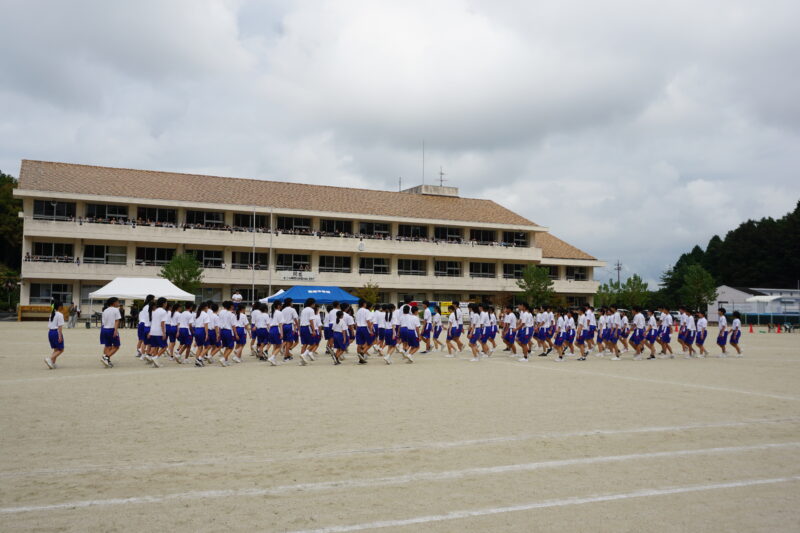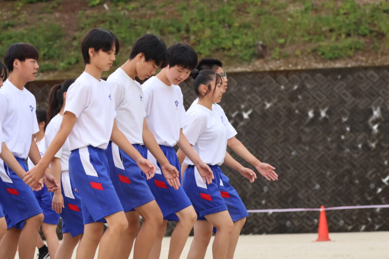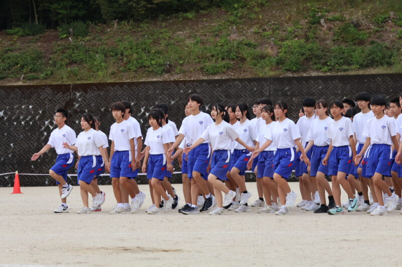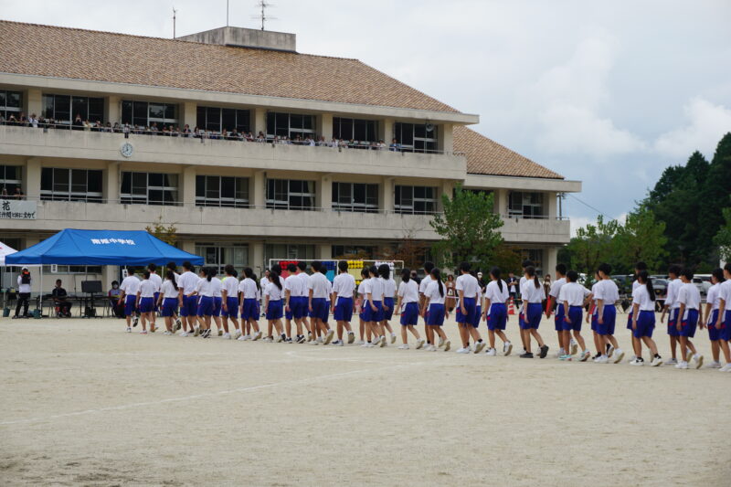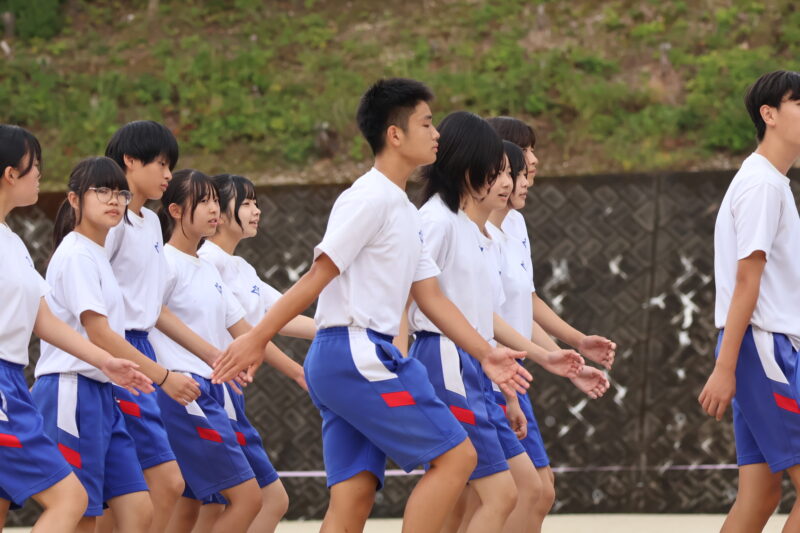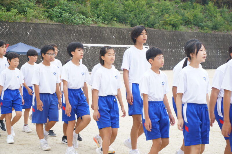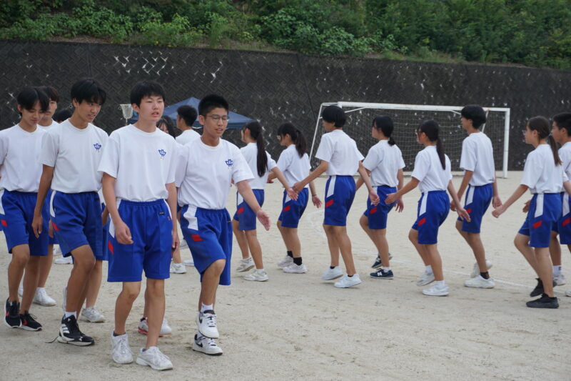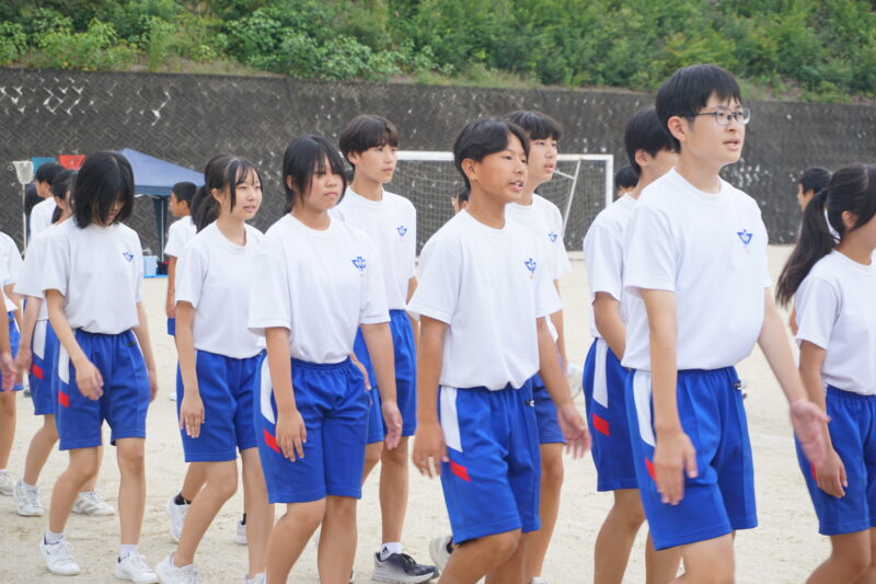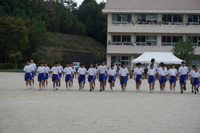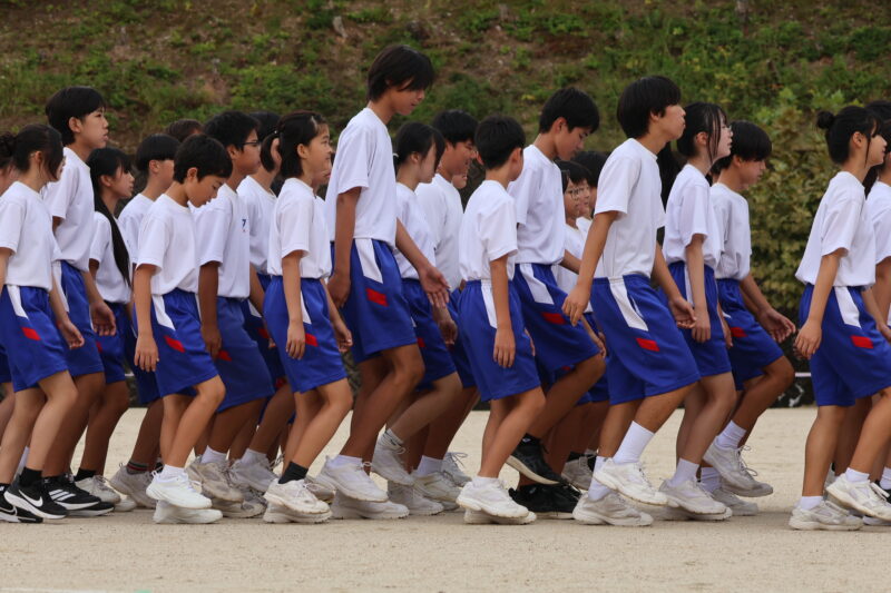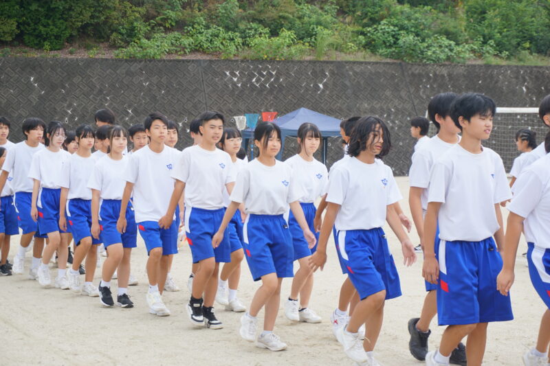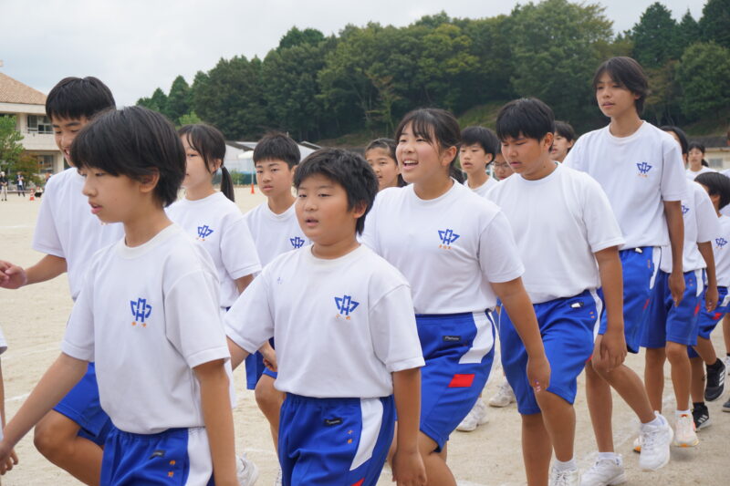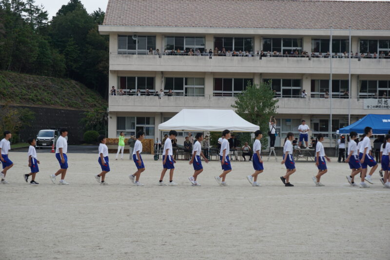 体育の時間に学年ごとに行った集団行動を、全校で合わせてみようと練習をしました。全校で練習した時間は、3時間ほど。それで、ここまで仕上げた生徒たち。