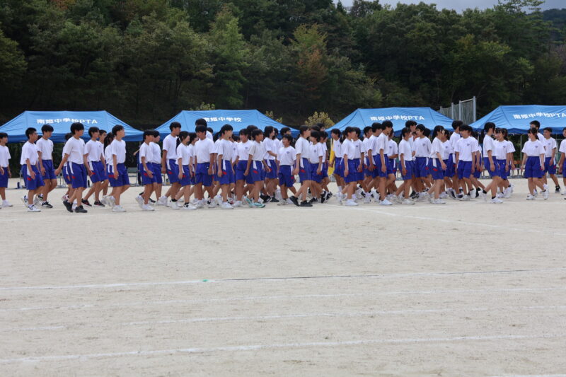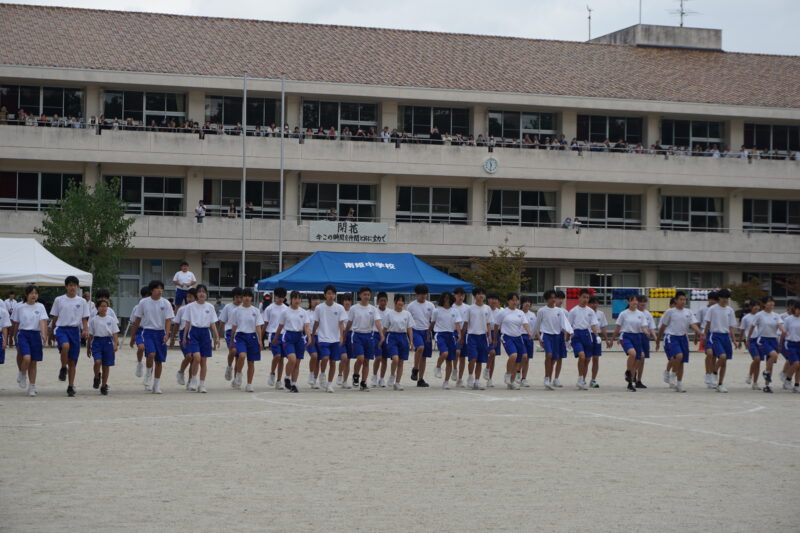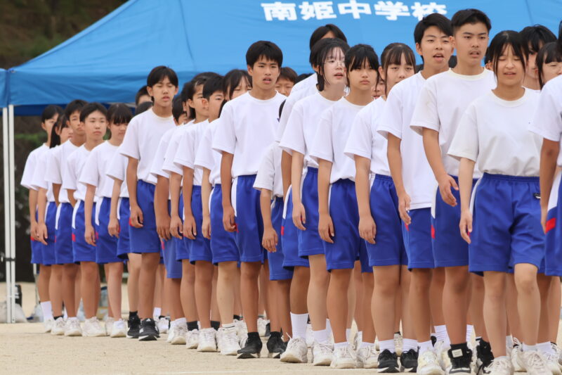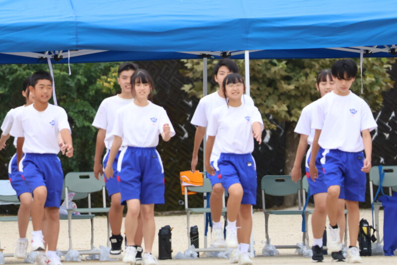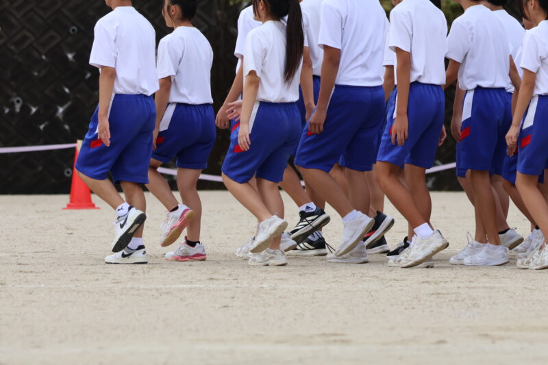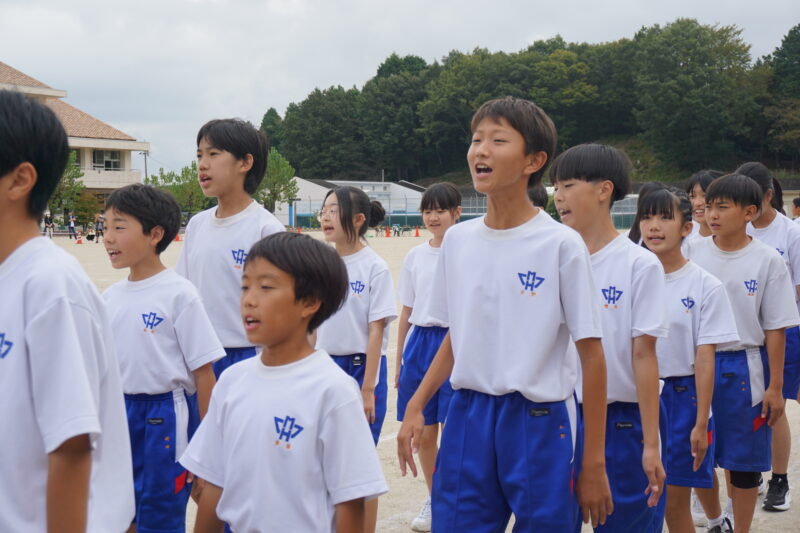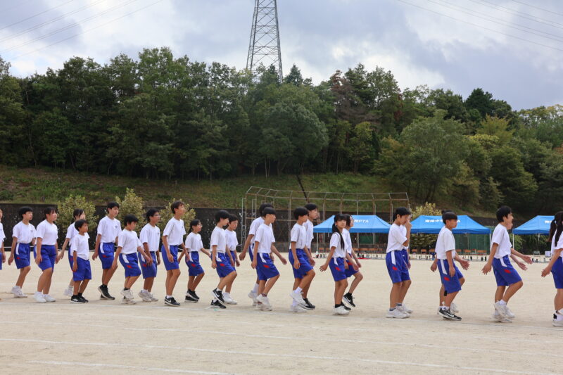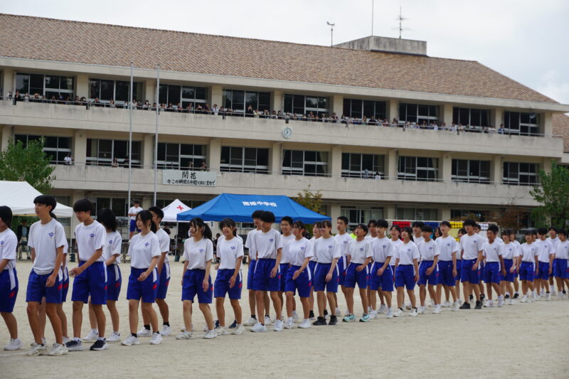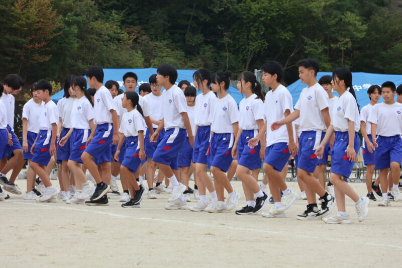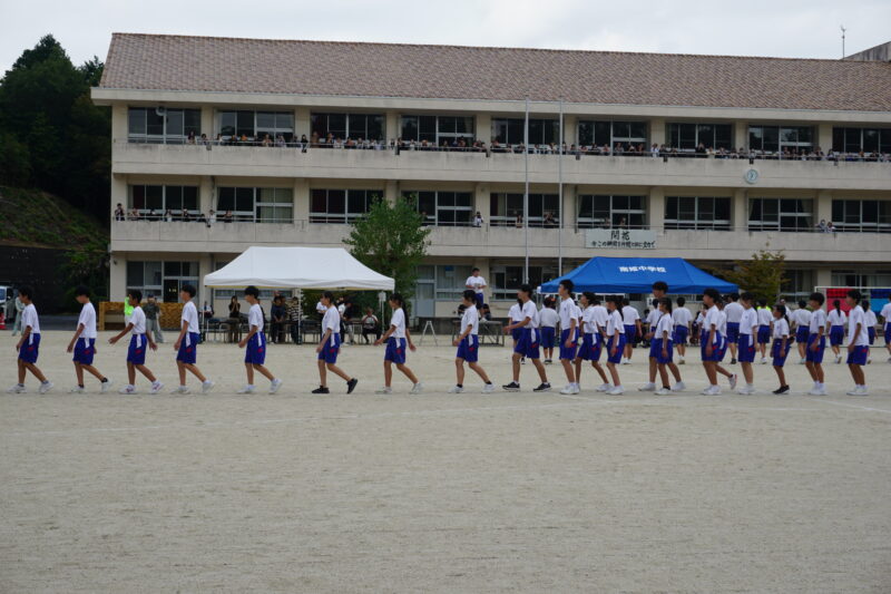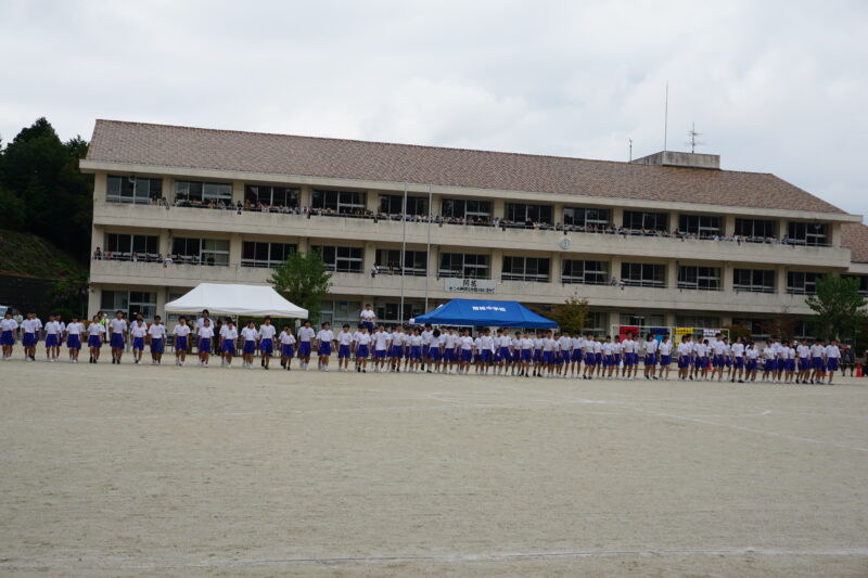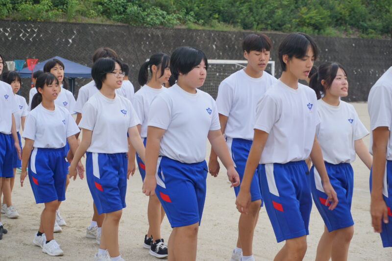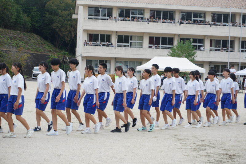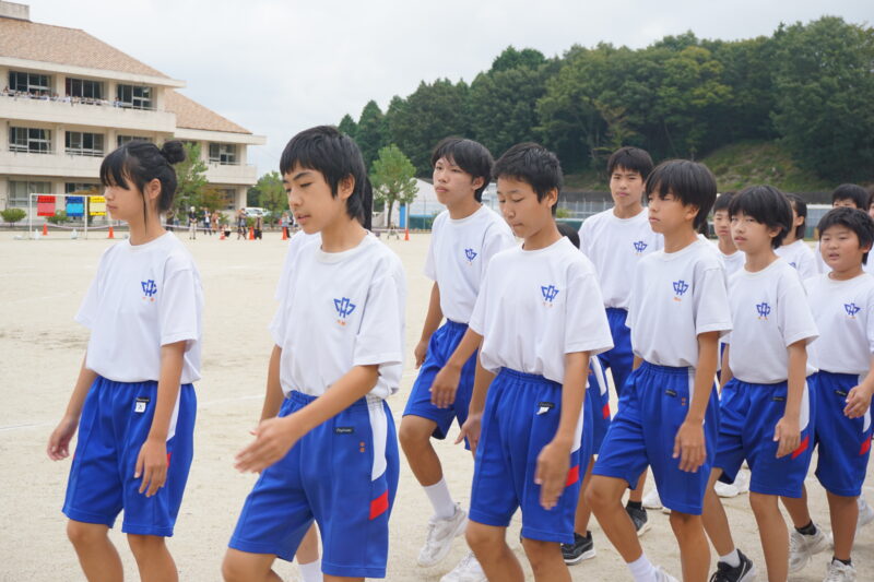 体育の時間に学年ごとに行った集団行動を、全校で合わせてみようと練習をしました。全校で練習した時間は、3時間ほど。それで、ここまで仕上げた生徒たち。