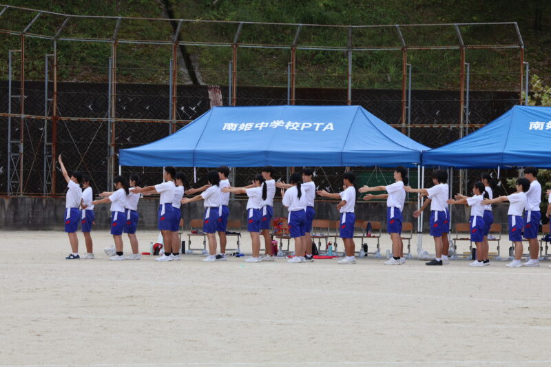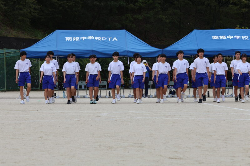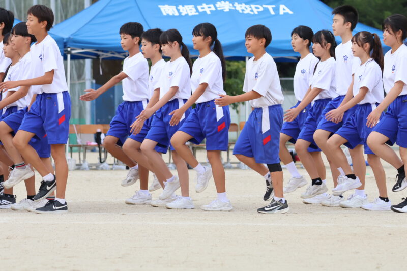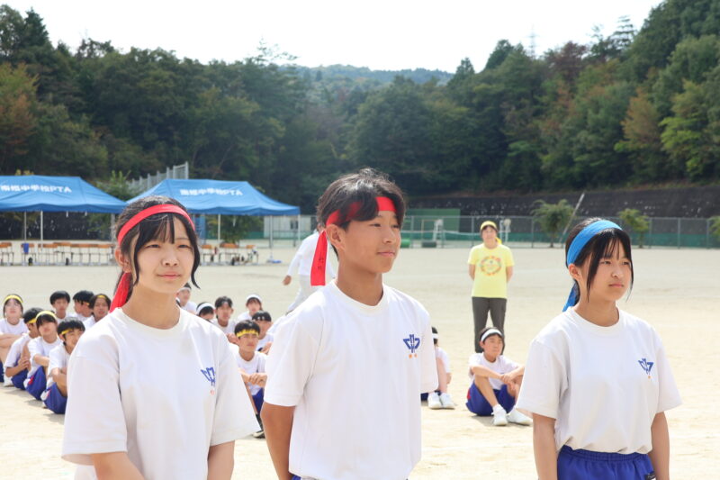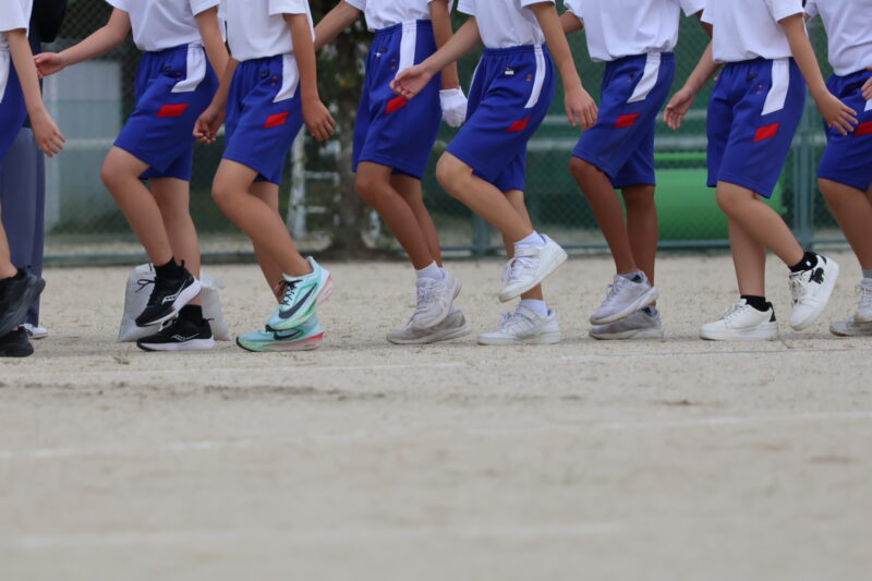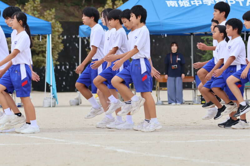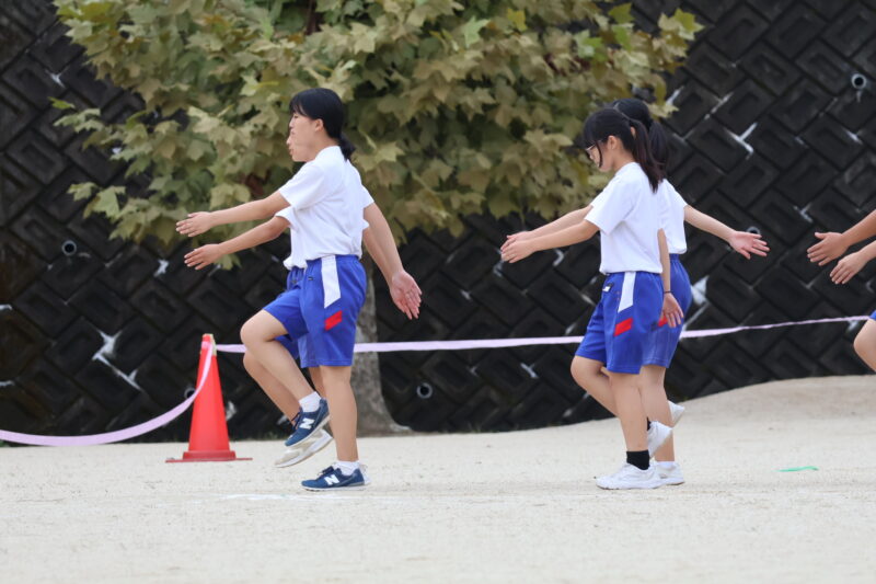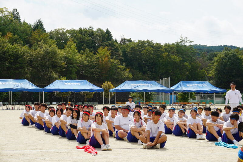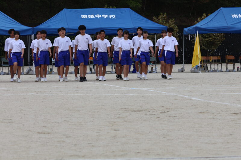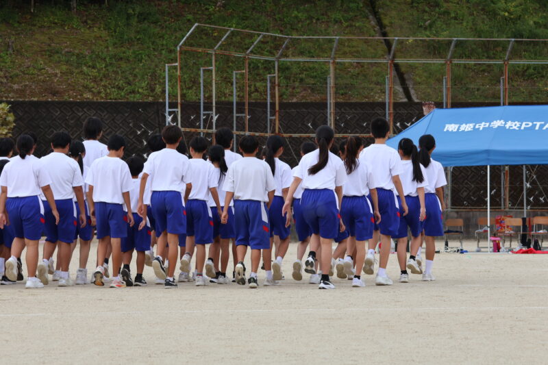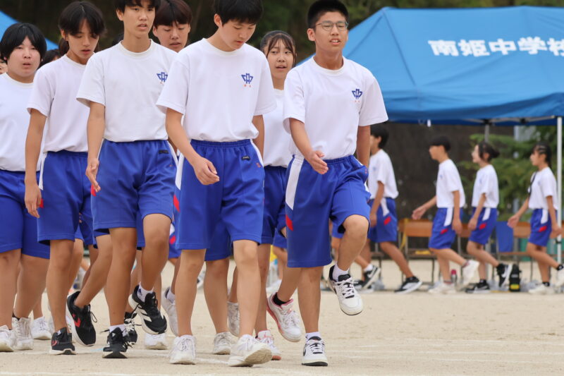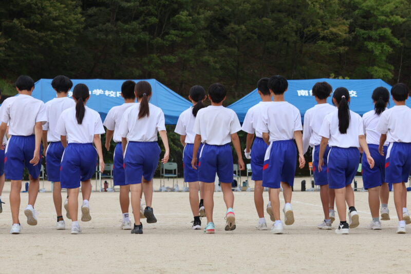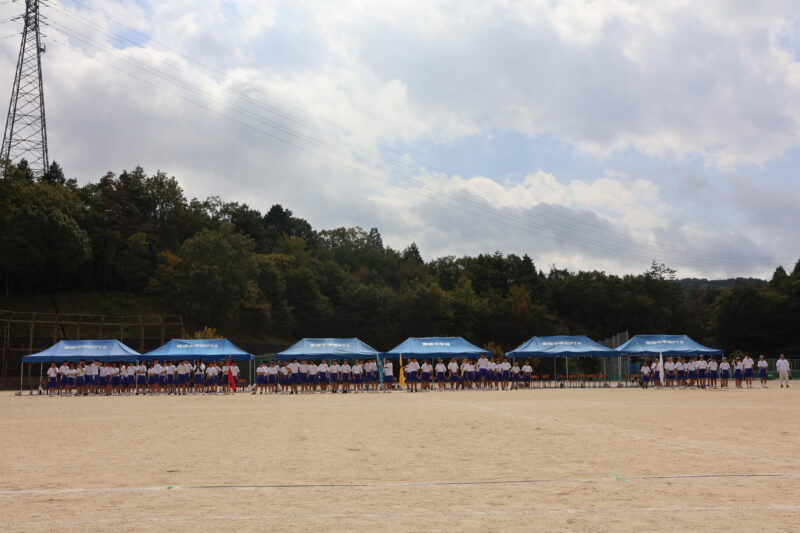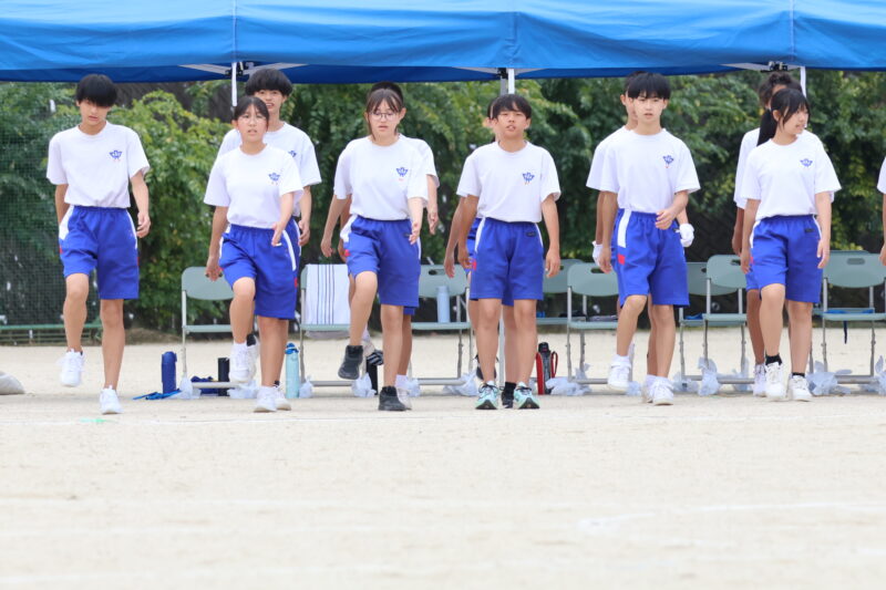 体育の時間に学年ごとに行った集団行動を、全校で合わせてみようと練習をしました。全校で練習した時間は、3時間ほど。それで、ここまで仕上げた生徒たち。