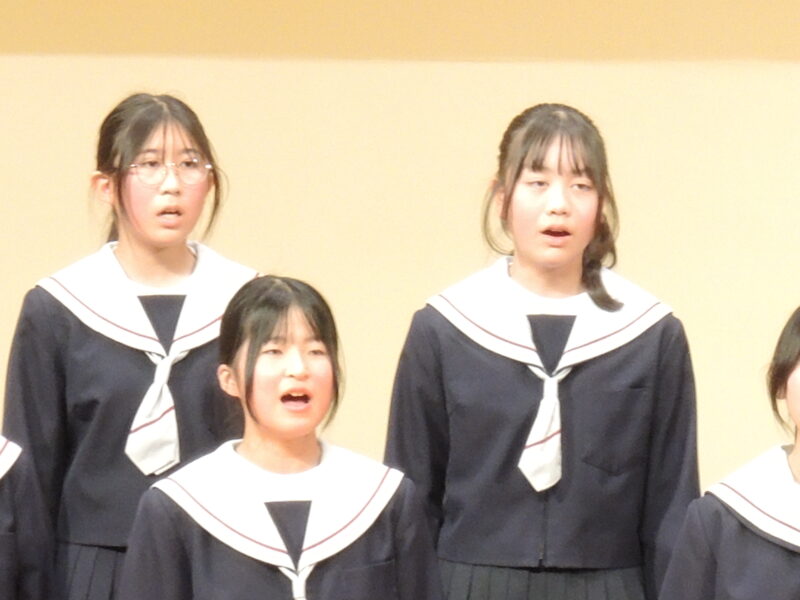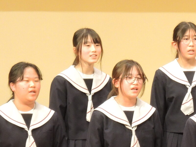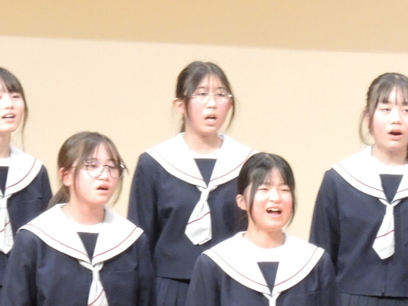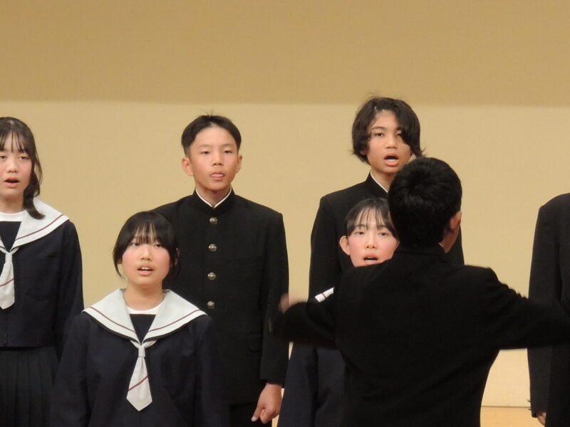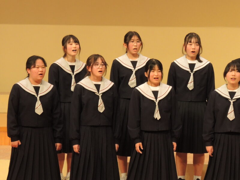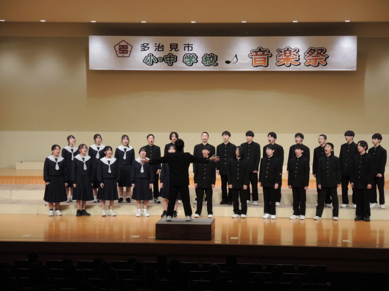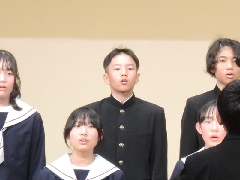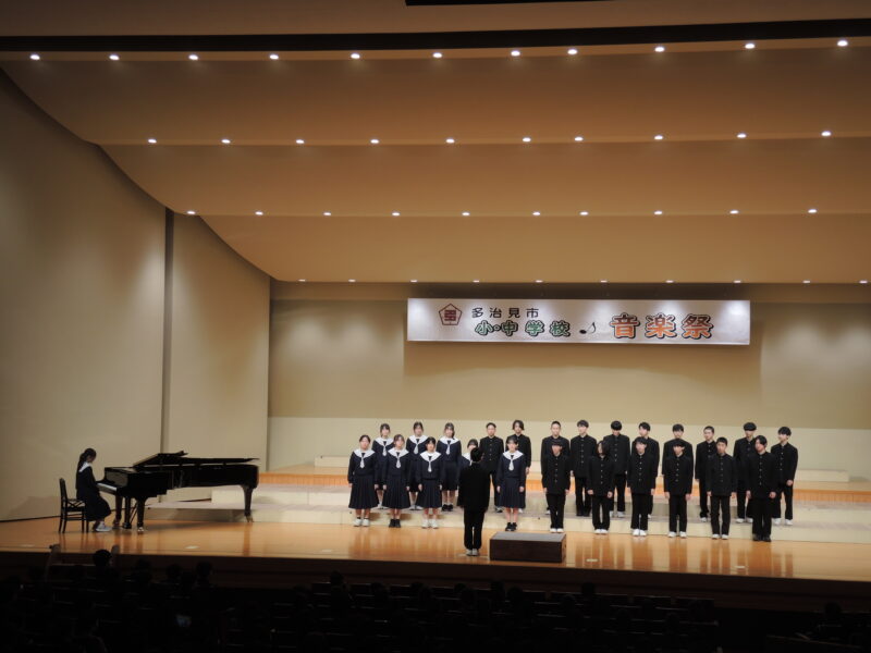 12月 11 2025 多治見市音楽祭 12月10日(水)、2年生が多治見市音楽祭に参加しました。 南姫中は、市内で一番生徒数が少ないため、トップバッター。 生徒たちは緊張していたようですが、名前が呼ばれると、会場に響き渡るはきはきとした声で返事をし、登壇しました。 人数が少ないことを感じさせないくらい、一人一人が声を出し、素敵な歌声が会場内に響き渡ってました。 講師の先生や多くの先生方から、「とてもよく声が出ていた。」とお褒めの言葉をたくさんいただきました。 2年生のみんな、かっこよかったよ!