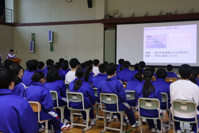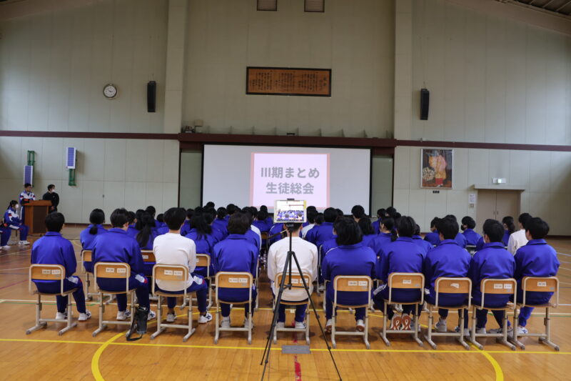 12月 17 2025 Ⅲ期生徒総会 12月17日(水)、Ⅲ期生徒総会を行いました。 生徒会と委員会のⅢ期のまとめとⅣ期についての発表です。 それぞれの発表を聞いた後は、縦割りグループで各自の振り返りの交流です。 Ⅲ期でできるようになったことはⅣ期で当たり前に、それに新たな力をみんなでつけていこうね!