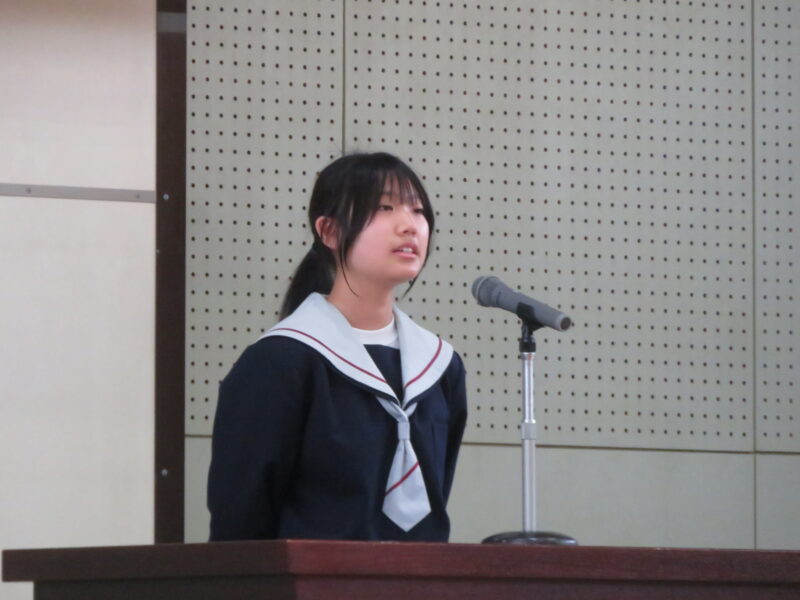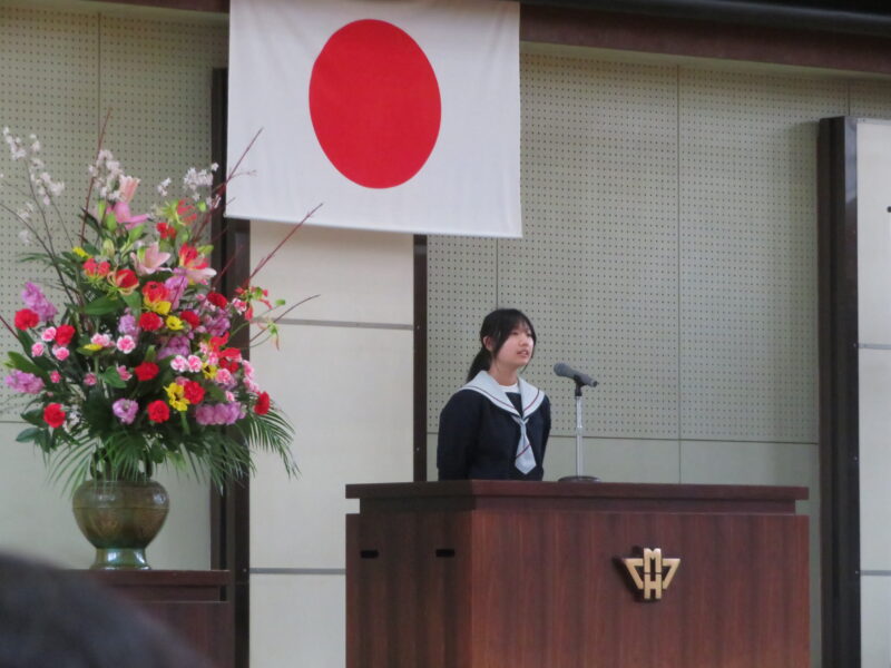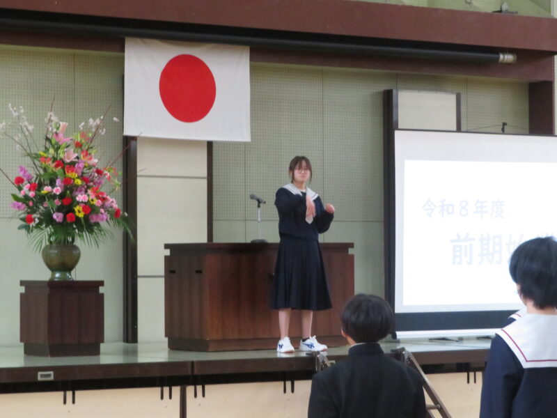 始業式では、生徒代表として、生徒会副会長の木村さんが、「誇れる姫中生へ」と題し、