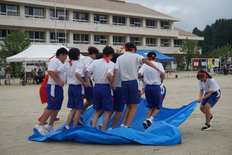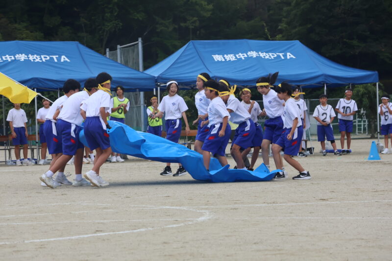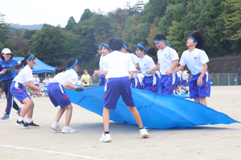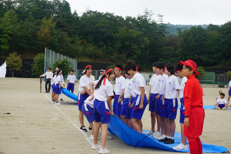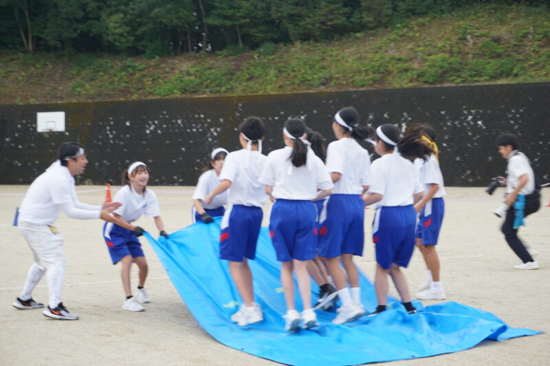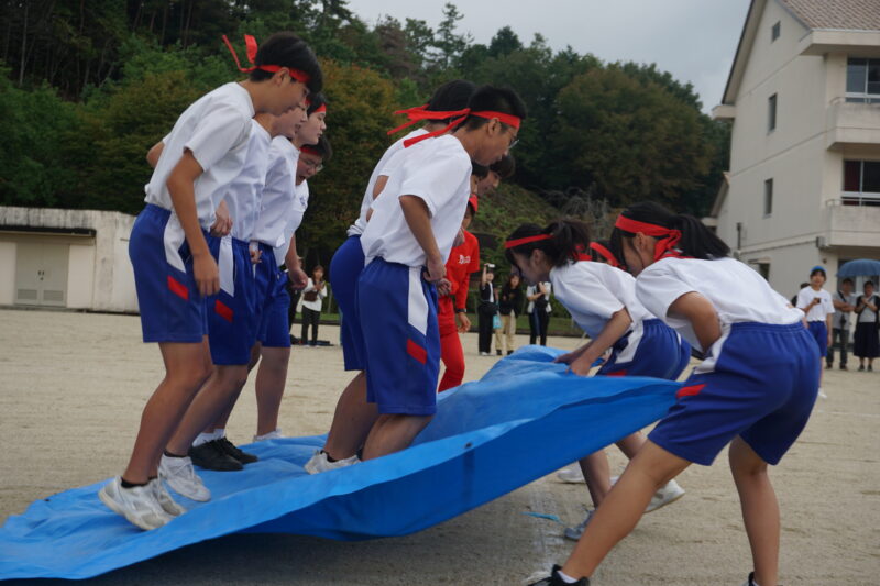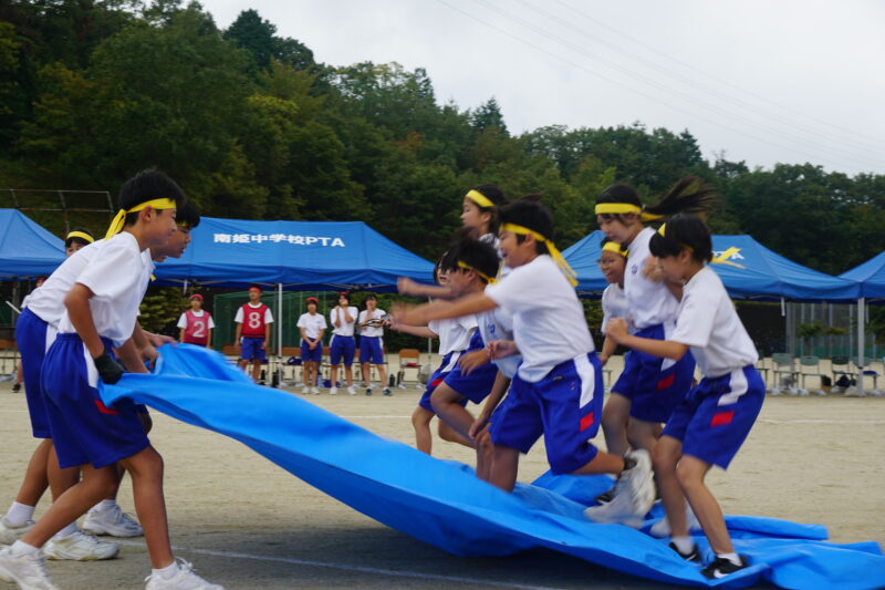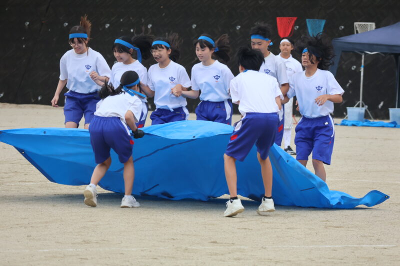 10月 02 2025 体育祭 part4:ブルーシートジャンプ 今年、新しく行うブルーシートジャンプ。引き手と乗り手に分かれて、ゴールを目指していきます。シートから落ちたら反則です。 1回戦目は、1年2組と3年1組です。 とてもいい勝負で、僅差で3年1組が勝ちました。 2回戦目は、1年1組と2年1組です。 1位は、一度も失敗しなかった2年1組でした。 どの学級も、練習の甲斐あって、新記録をたたき出していました。