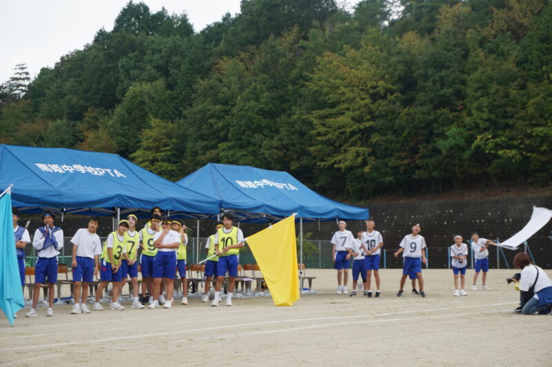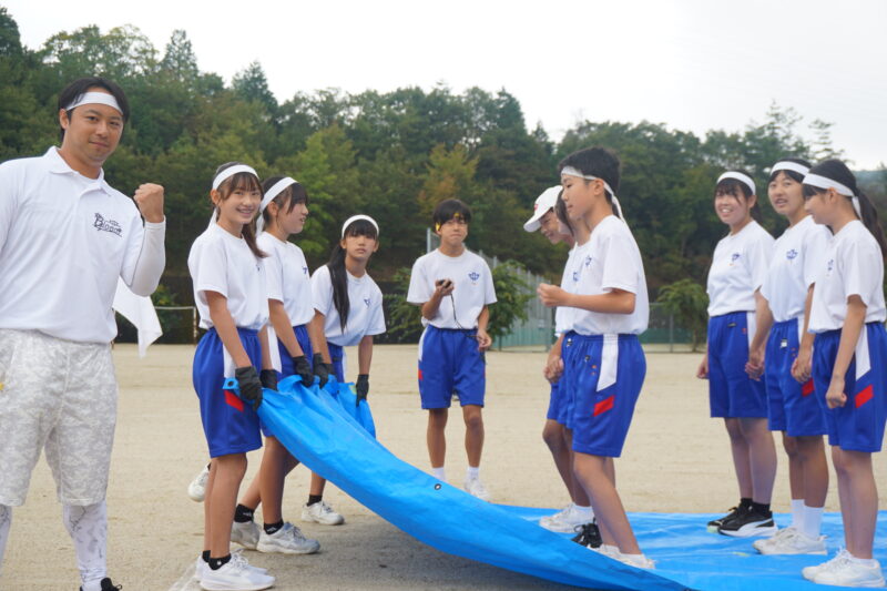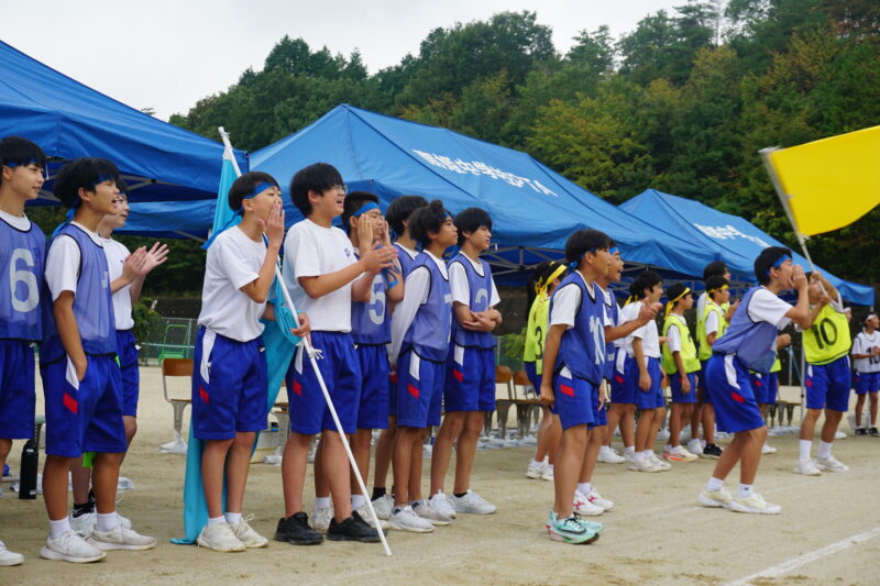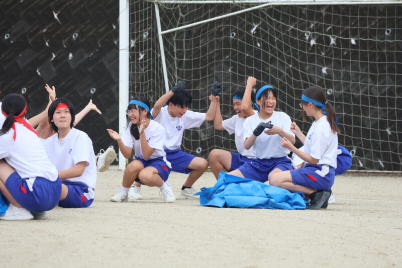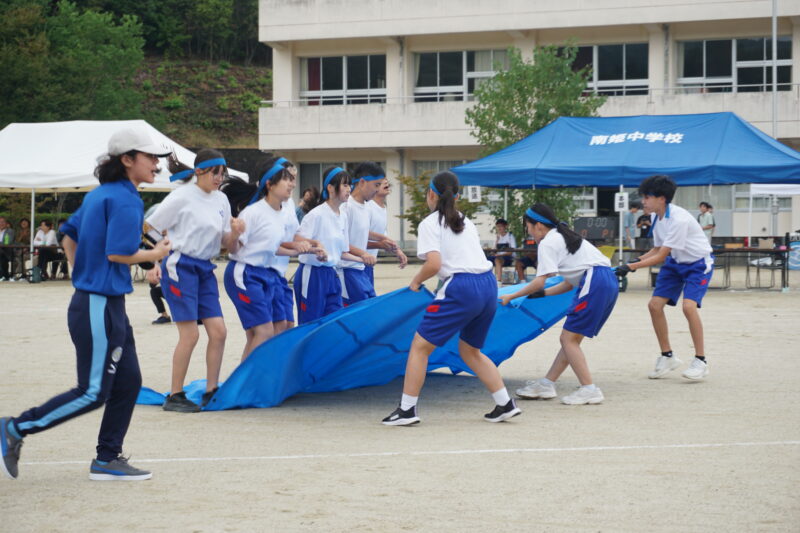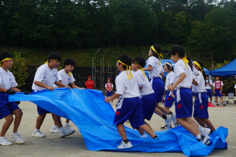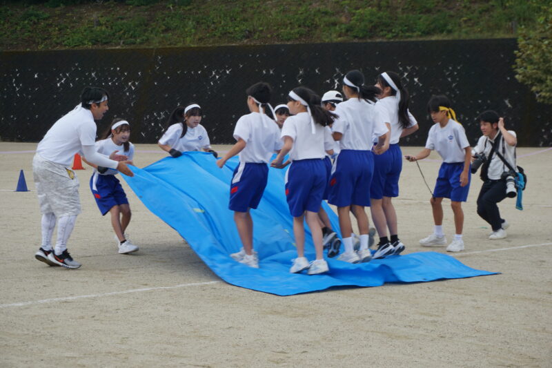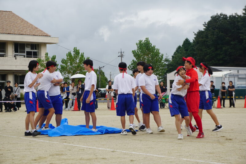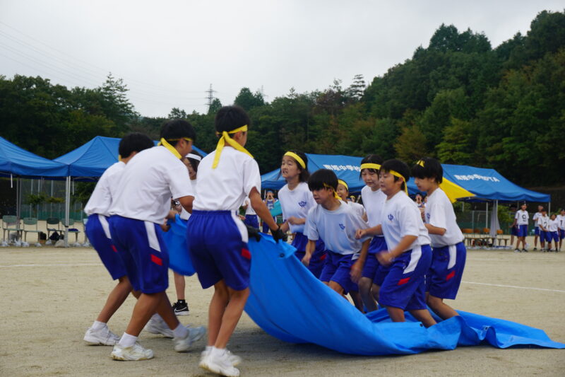 10月 02 2025 体育祭 part4:ブルーシートジャンプ 今年、新しく行うブルーシートジャンプ。引き手と乗り手に分かれて、ゴールを目指していきます。シートから落ちたら反則です。 1回戦目は、1年2組と3年1組です。 とてもいい勝負で、僅差で3年1組が勝ちました。 2回戦目は、1年1組と2年1組です。 1位は、一度も失敗しなかった2年1組でした。 どの学級も、練習の甲斐あって、新記録をたたき出していました。