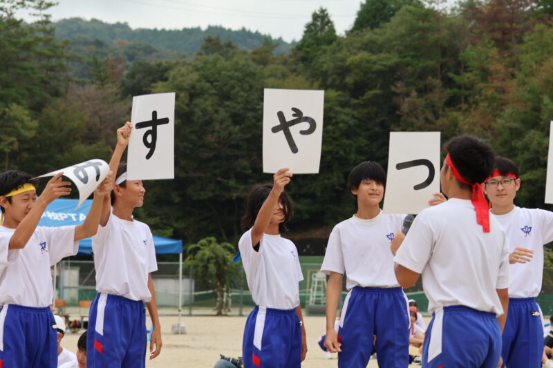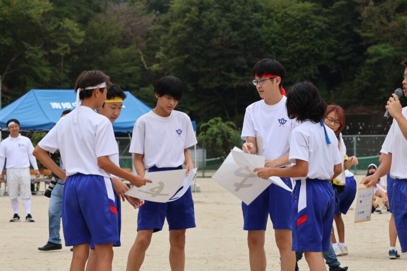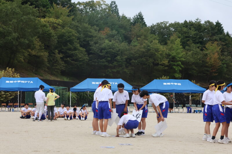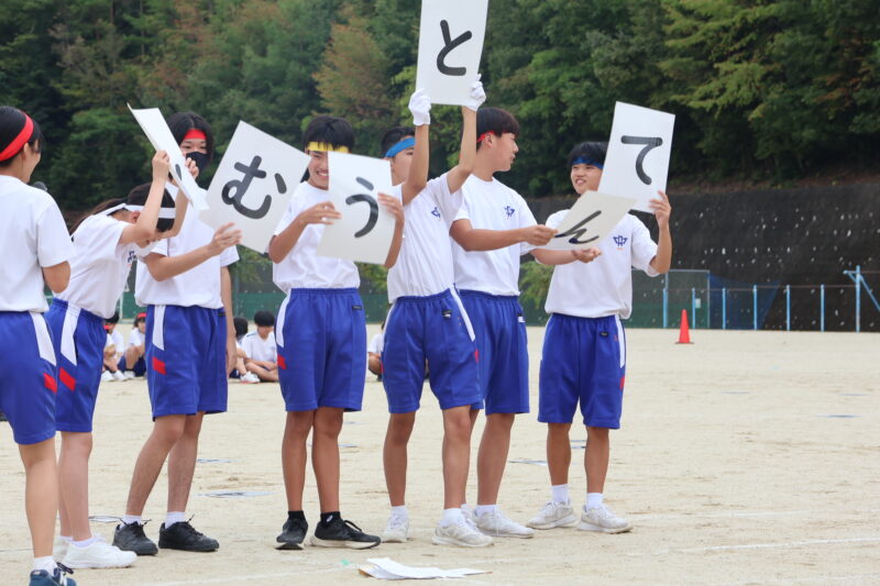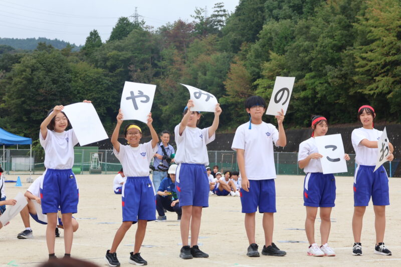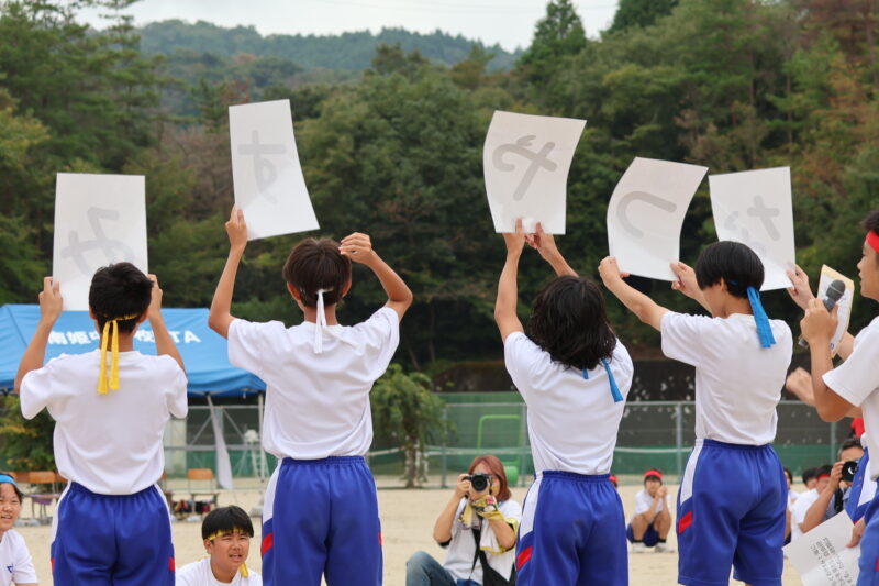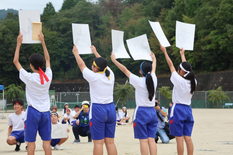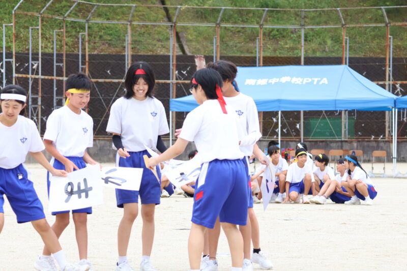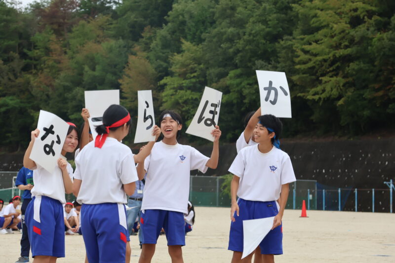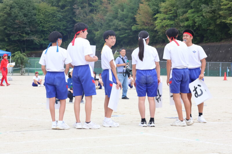 10月 02 2025 体育祭 part6:縦割り種目 体育祭の点数の入る競技種目は学級ごと。「せっかく縦割りで活動しているから、何か楽しい種目を取り入れよう」と生徒会が考えた種目。 それぞれのグループごとにお題が配られ、その答えを考え、グラウンドに散らばっているひらがなカードを集め、全員で答えを言うというものでした。 グループで相談したり協力してカードを探したりして、とても仲の深まるいい種目だったなぁと思いました。ちょっと長かったけどね~。 生徒会の皆さん、素敵な種目を考えたね~。見ていてほんわか温かくなりました。