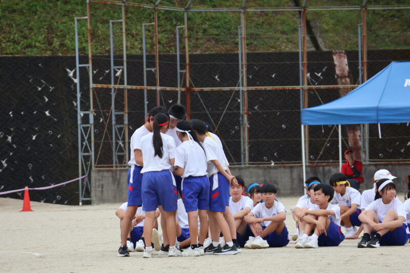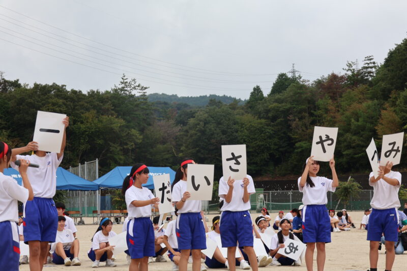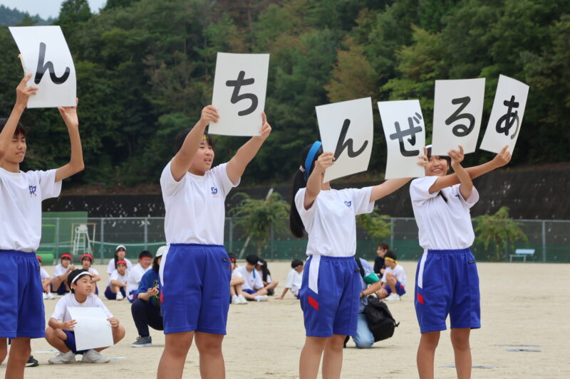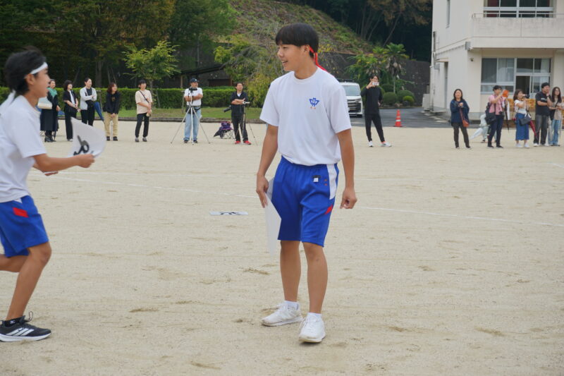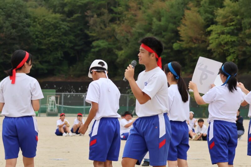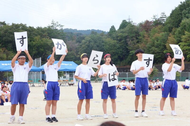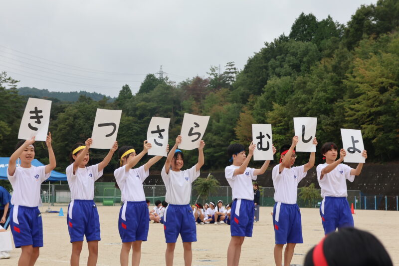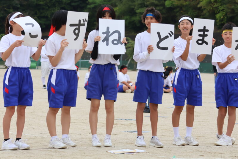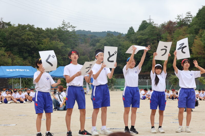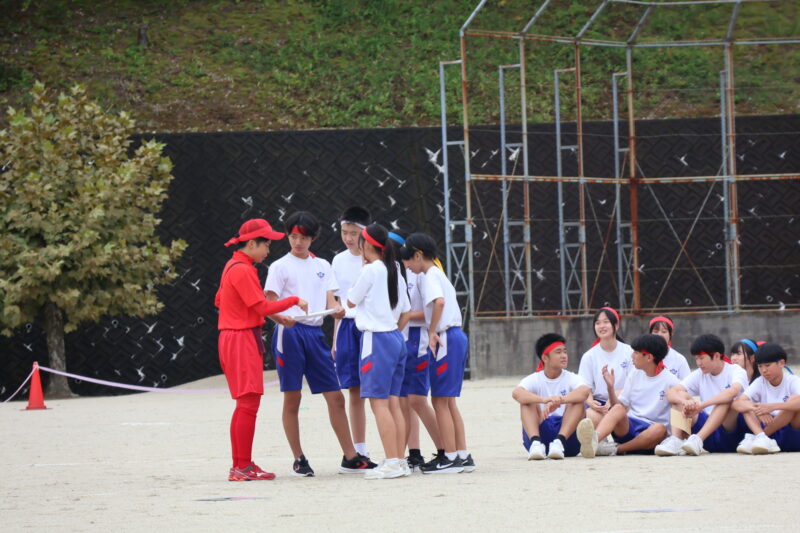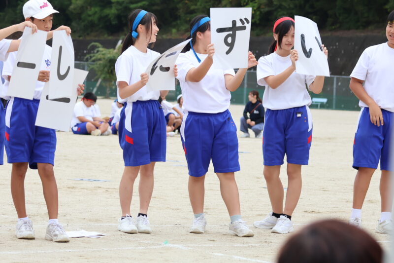 10月 02 2025 体育祭 part6:縦割り種目 体育祭の点数の入る競技種目は学級ごと。「せっかく縦割りで活動しているから、何か楽しい種目を取り入れよう」と生徒会が考えた種目。 それぞれのグループごとにお題が配られ、その答えを考え、グラウンドに散らばっているひらがなカードを集め、全員で答えを言うというものでした。 グループで相談したり協力してカードを探したりして、とても仲の深まるいい種目だったなぁと思いました。ちょっと長かったけどね~。 生徒会の皆さん、素敵な種目を考えたね~。見ていてほんわか温かくなりました。