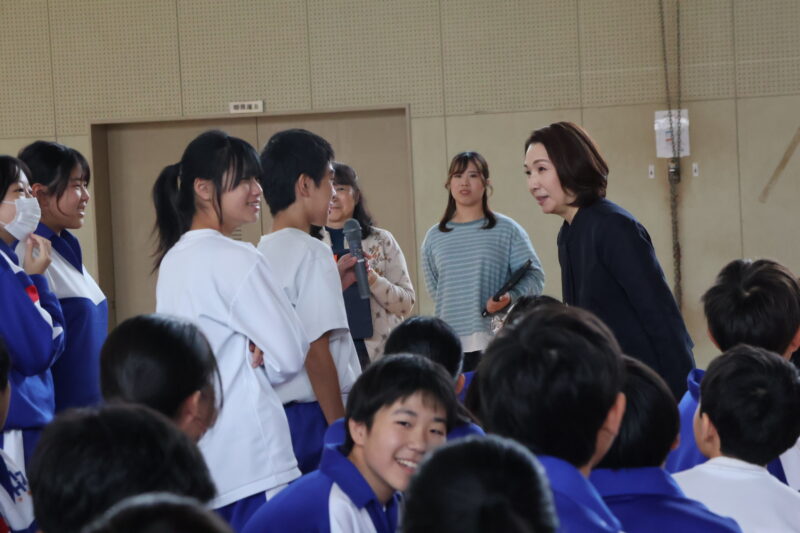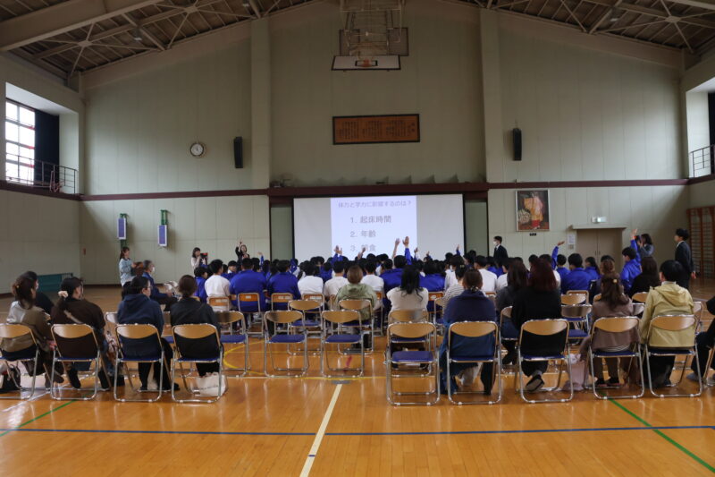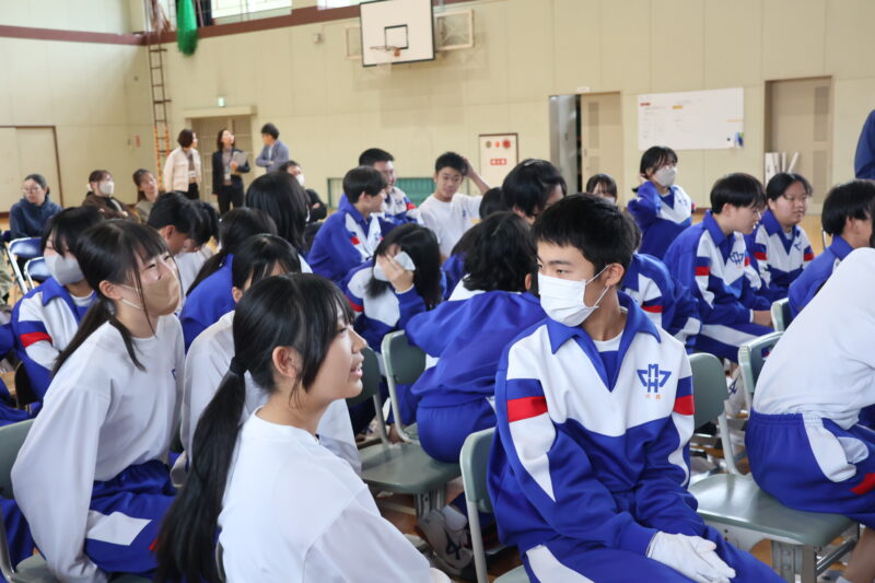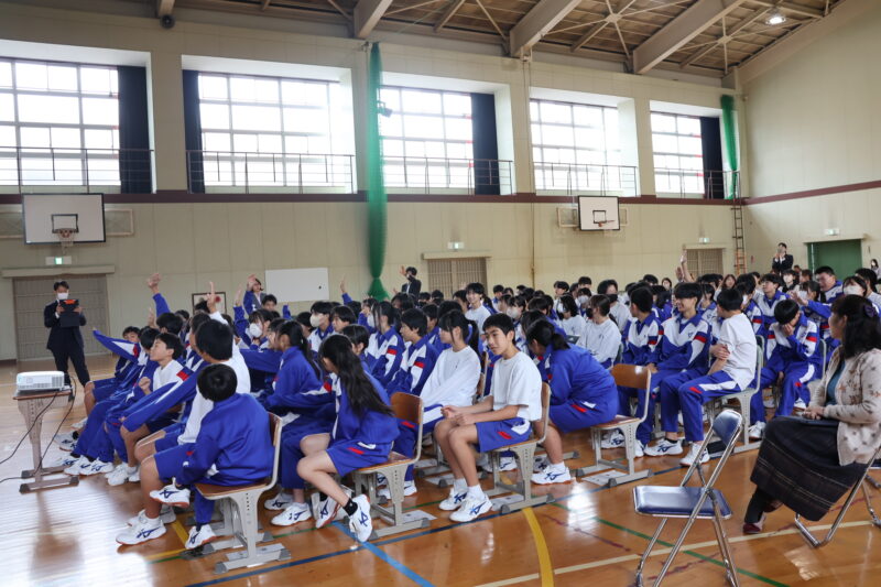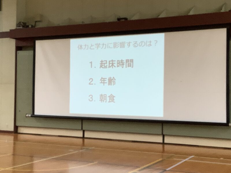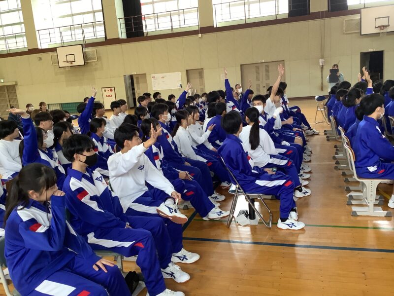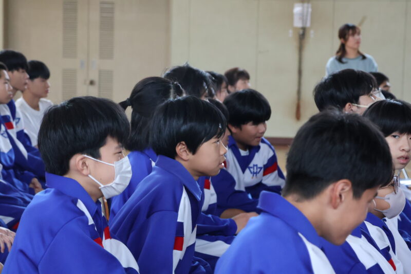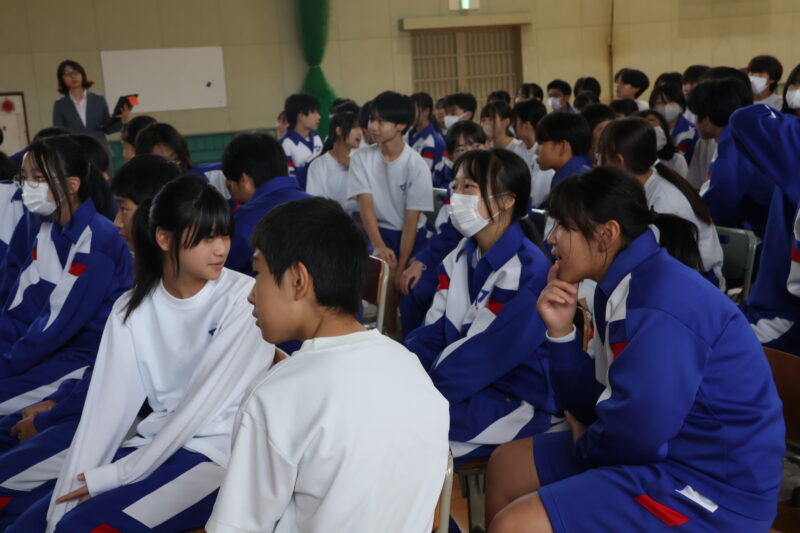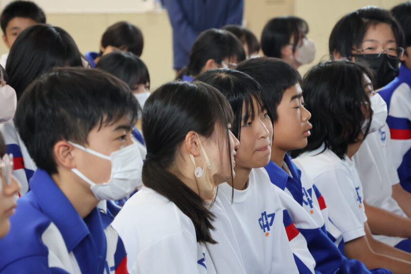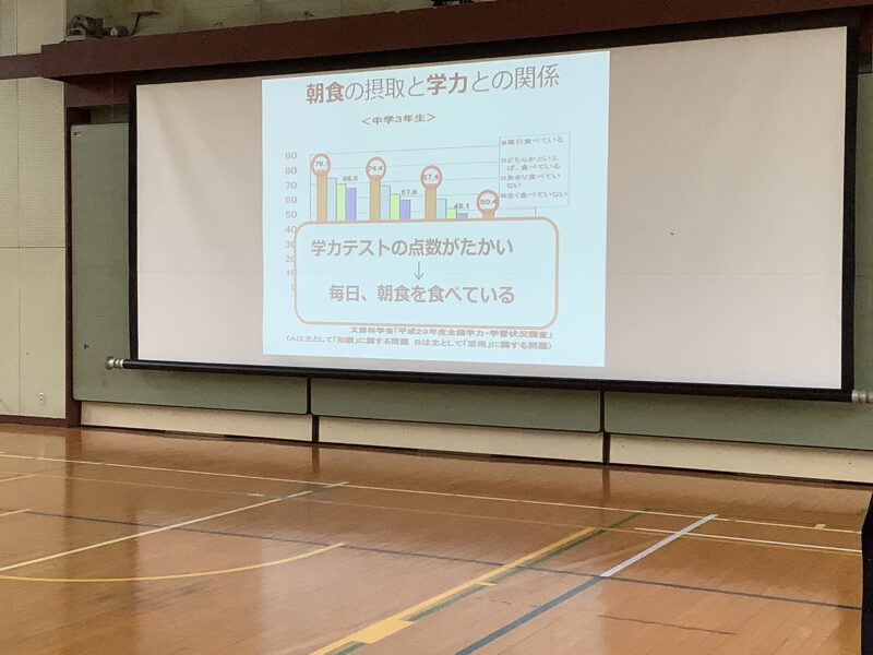 11月 05 2025 栄養講座 「成長期の中学生のための勉強、スポーツ、健康に役立つ食事の選び方」 11月5日(水)、名古屋グランパスの管理栄養士でもある森裕子先生を講師にお招きし、栄養講座を行いました。 スポーツ選手のパフォーマンスが上がるように、栄養等を管理していらっしゃる森先生の話は、説得力があり、生徒たちはとても関心をもって聞きました。 途中クイズを交えながら、どういう選択をするとよいか、自分たちで考え、明日からの食事の選択に役立つお話でした。 何人かの生徒たちの朝ごはんが変わるかな。 森先生、ありがとうございました。