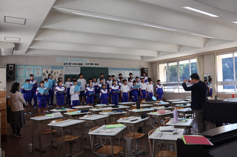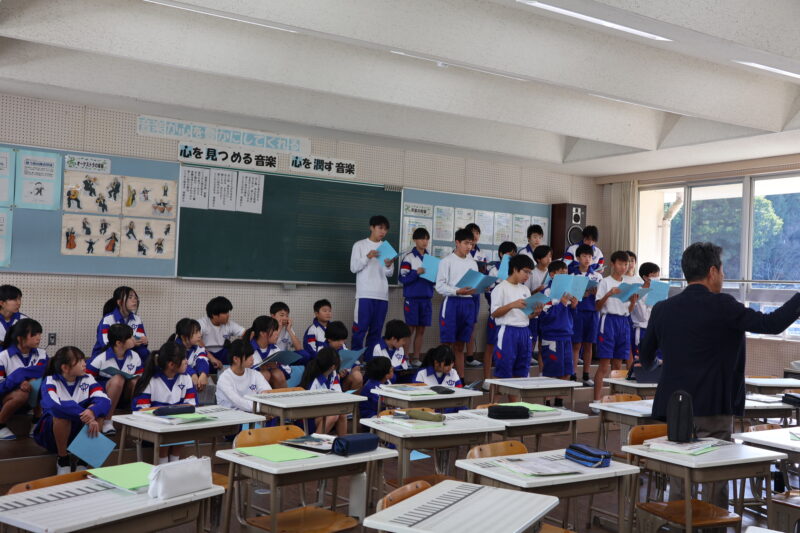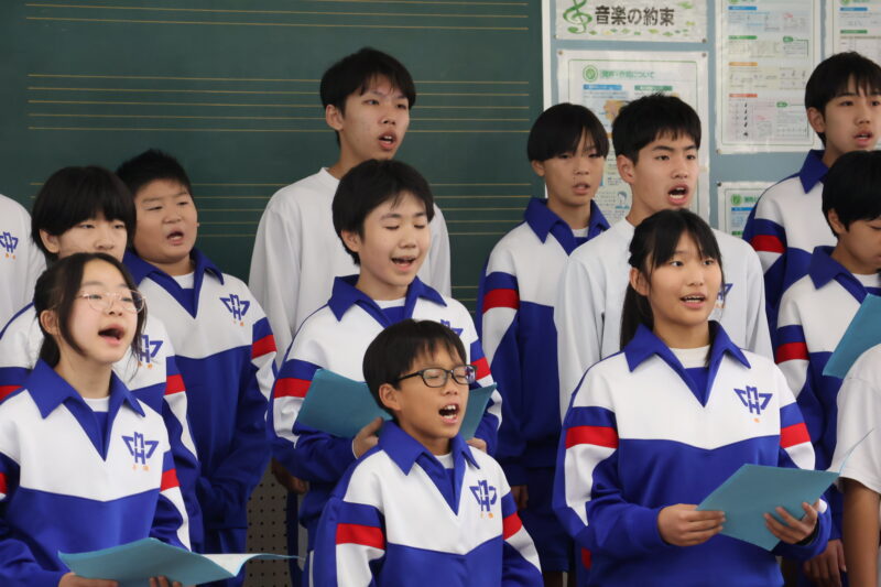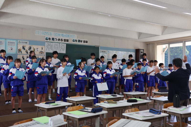 11月 06 2025 田中先生による合唱指導 11月6日(木)、岐阜市で校長先生をしていらした田中先生を講師に招いて、合唱祭に向けて合唱指導を行っていただきました。 田中先生に、生徒たちのよさをほめていただきながら、こうするともっと伸びるところを指導いただき、1時間という短い時間に、合唱がずいぶん変わりました。 「この後は、学級でがんばって。きっといい合唱になるよ。」と、言葉をいただきました。 田中先生、ご指導ありがとうございました。