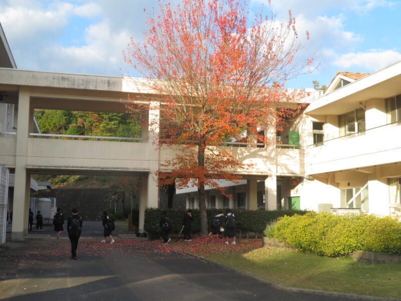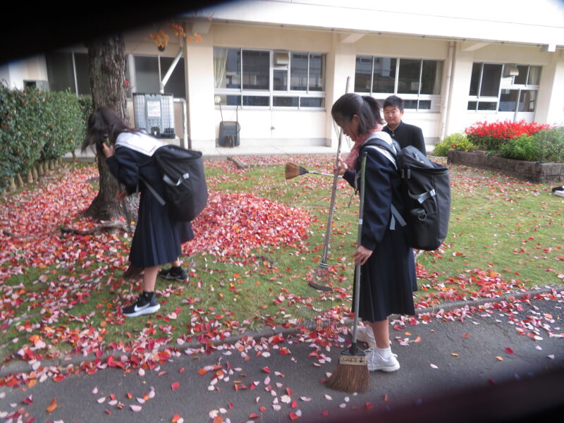 11月 20 2025 秋の朝 11月に入り、校庭の木々も色づき、葉がちらほらと落ち始めました。 地面に落ちた葉を、1年生の生徒が集めてくれてます。 おかげで、とてもきれいになりました。ありがとうね。 そして時には・・・。落ち葉で遊んでいます。