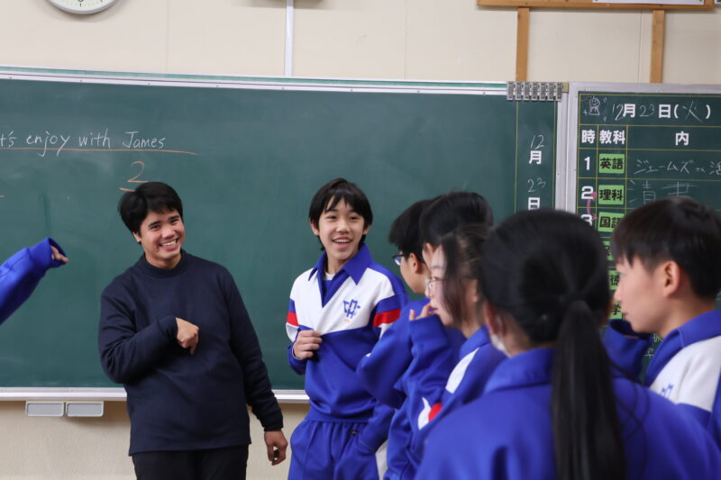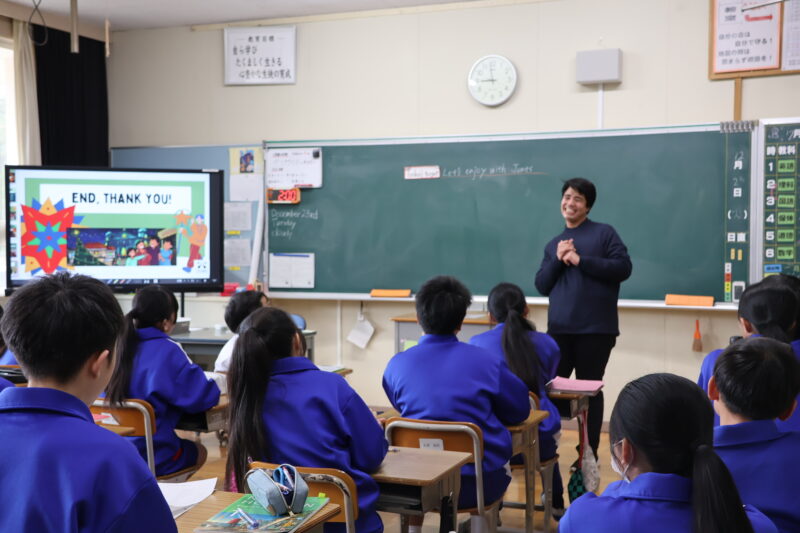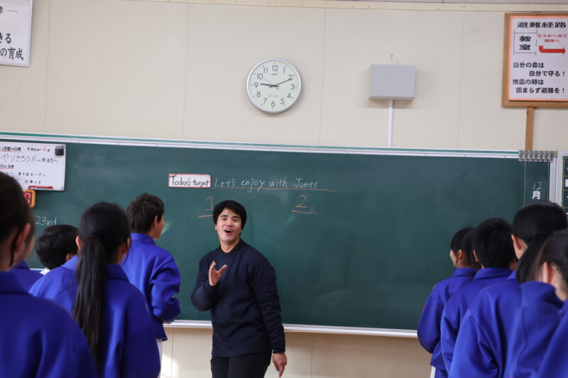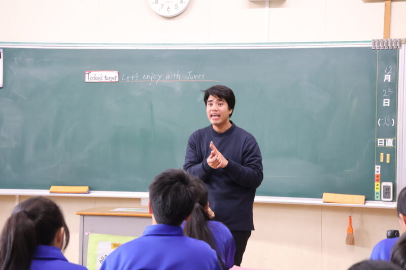 12月 24 2025 JAMES先生との英語 12月23日(火)、ALTのマサ先生の代打として、JAMES(ジェームス)先生が、授業に参加してくださいました。 JAMES先生の紹介や、クリスマスにちなんだ伝言ゲームなどをしながら、英語の学習を楽しんでいました。また、1年生のドッジボールに参加して、汗をいっぱいかいていました。 JAMES先生、ありがとうございました。