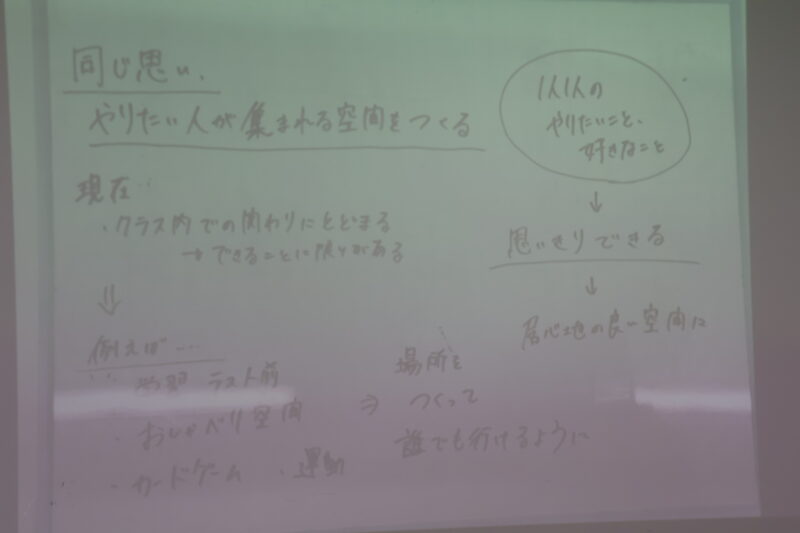 「一人一人が自分らしく生活できるには」ということについて、各グループでアイディアを出し合いました。どのグループも、なるほどなぁと思う意見ばかりで、これが実現できたら。学校が安心できる居場所になるんだろうなと思いました。