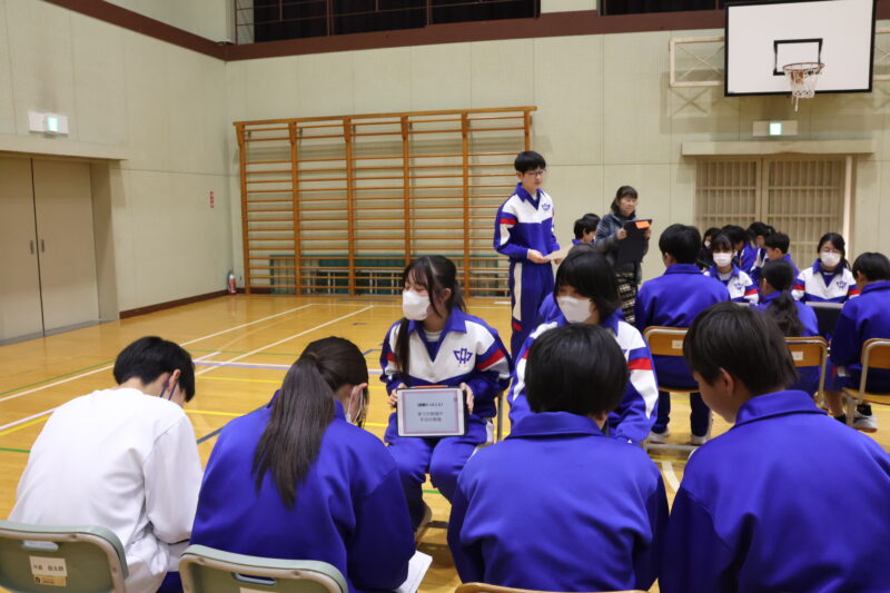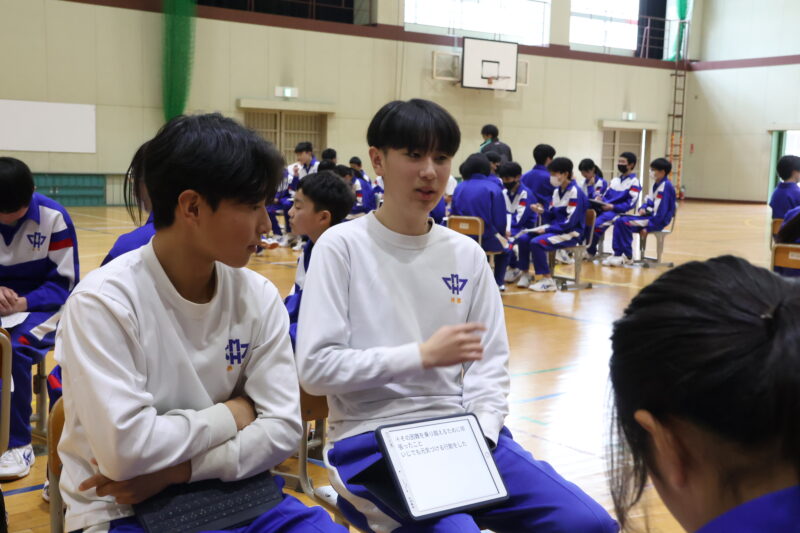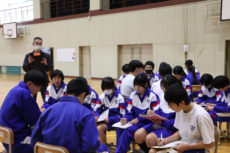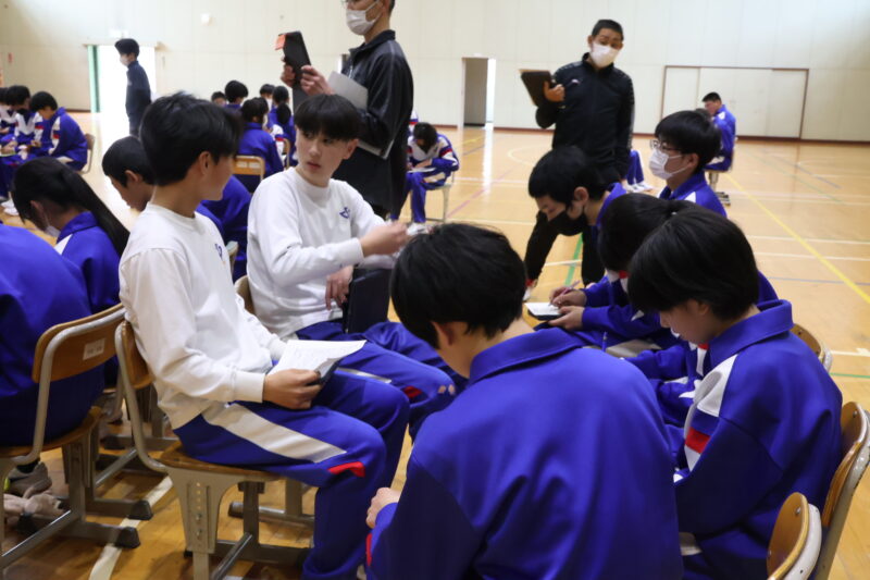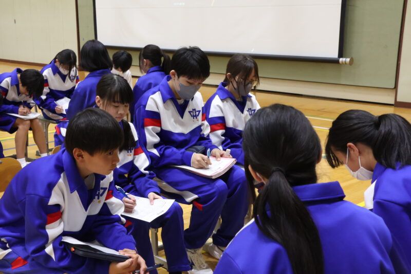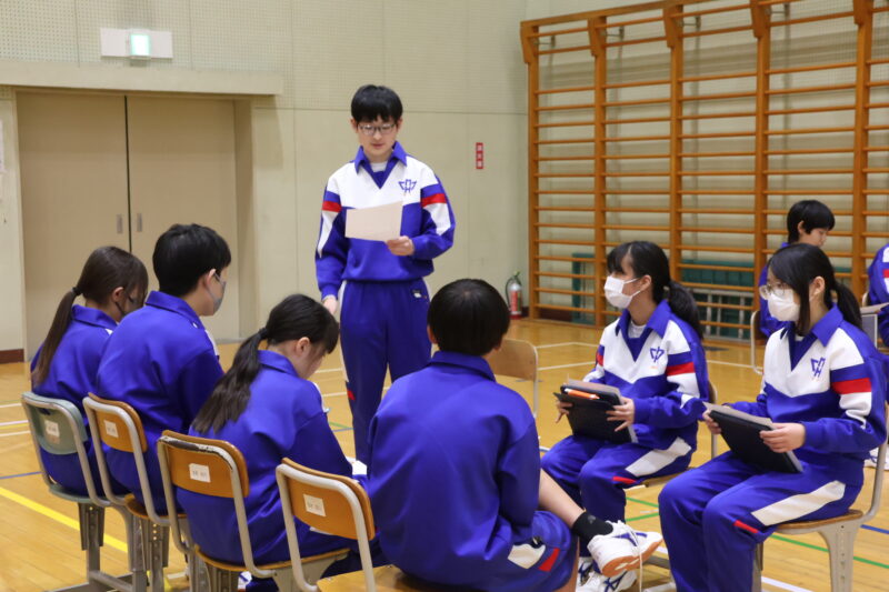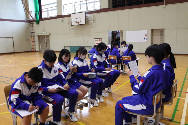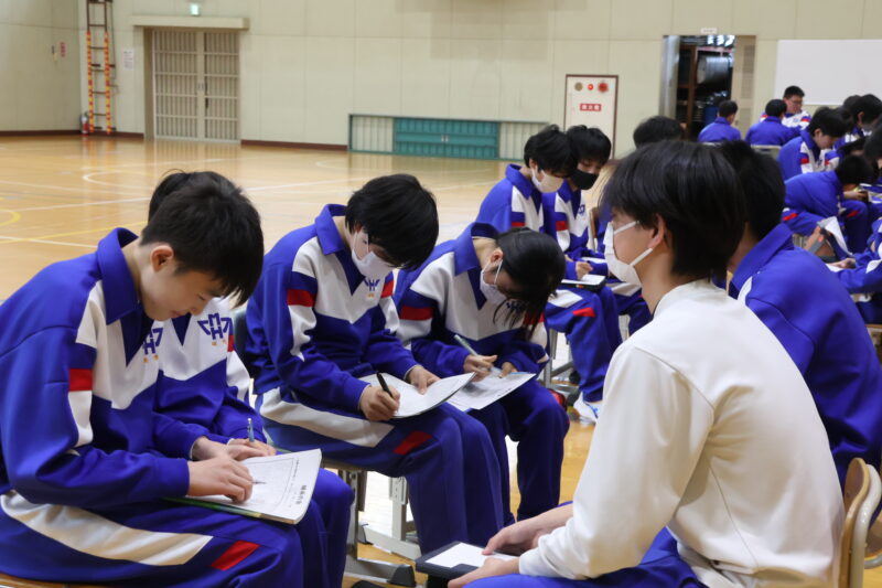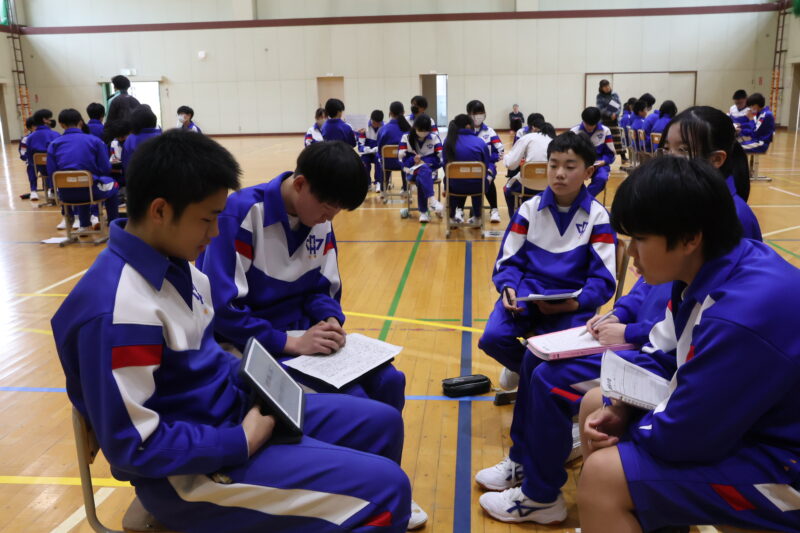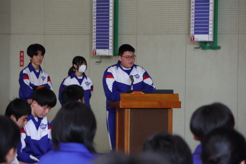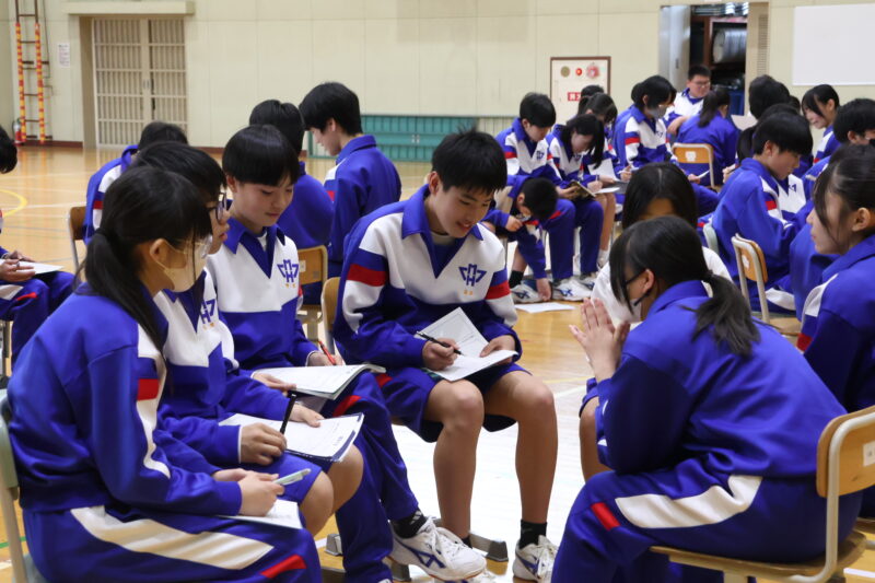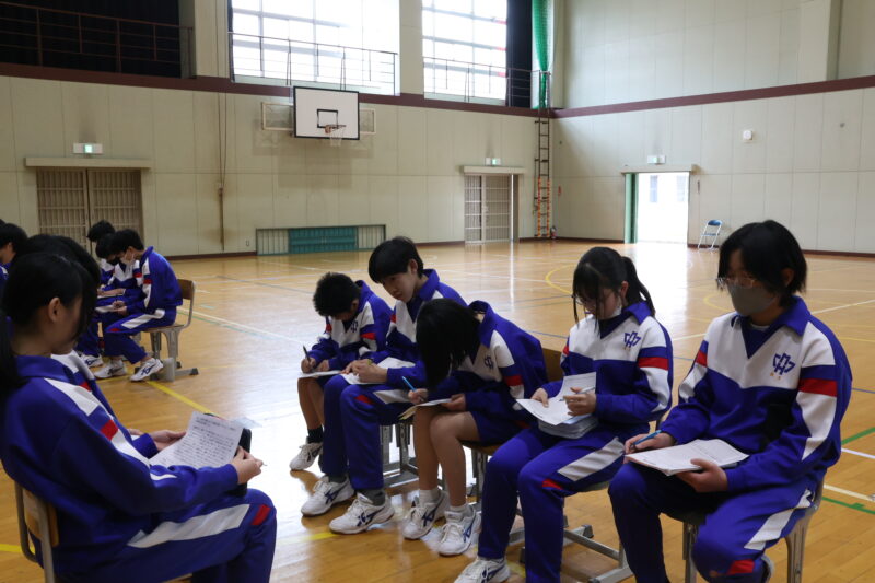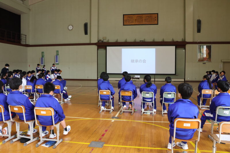 2月 25 2026 継承の会 2月24日(火)、3年生が企画をした継承の会が行われました。 今年の継承の会は、学習・生活・行事の3点から、3年生一人一人が、1・2年生に自分たちが感じたことや大事にしたことなどを語りました。 3年生の話を聞きながら、一人一人この3年間の自分自身を見つめ語る姿に成長を感じました。また、話を聞く1・2年生は、真剣に聞き、大事にしたいことをメモしていました。 この関係が、とっても温かいなぁと感じた会でした。
