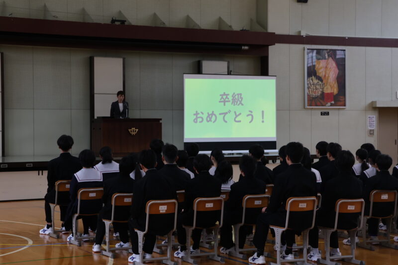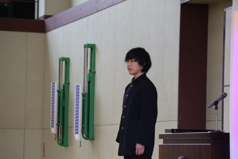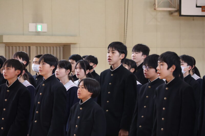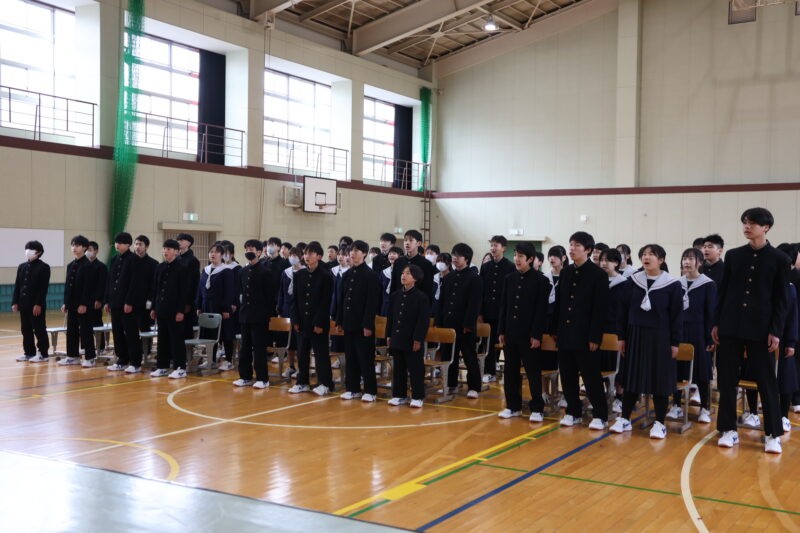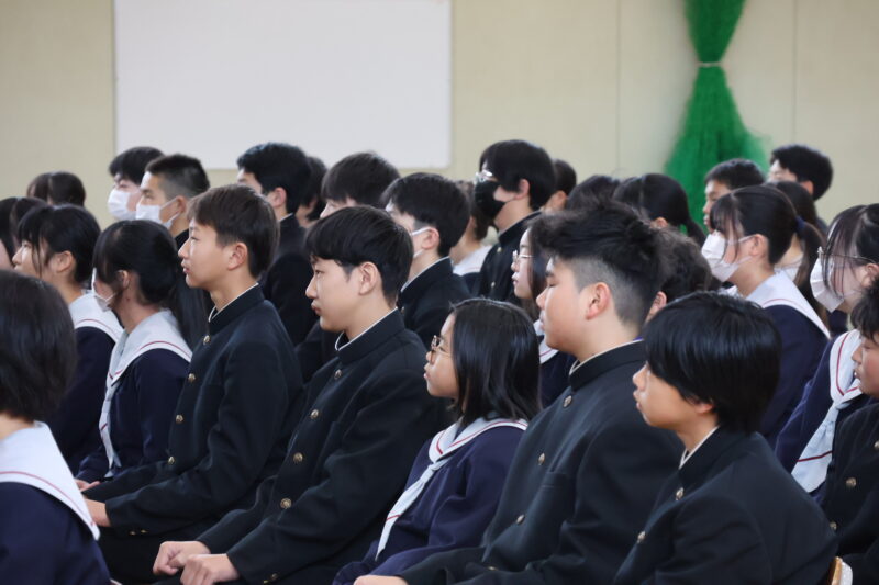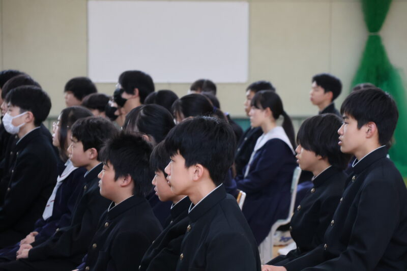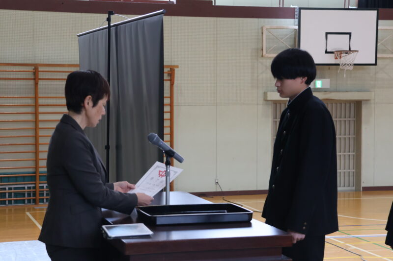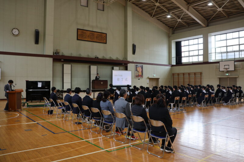 3月 26 2026 令和7年度 修了式 3月26日(木)、令和7年度修了式を行いました。 3年生がいなくなった体育館は、とってもこじんまりとしていましたが、凛とした空気の中、締めくくりの式を行うことができました。 学年代表への修了証授与。 生徒代表の話。2年生を代表して、3月で転校する藤田さんが、堂々と自分の思いを語りました。仲間のおかげで乗り越えられたこと、力をつけたことなど、自分をよく見つめ、成長が感じられる素晴らしい発表でした。 1・2年生全員、目標に向かって仲間と取り組んだ一年でした。卒級おめでとう!