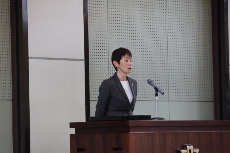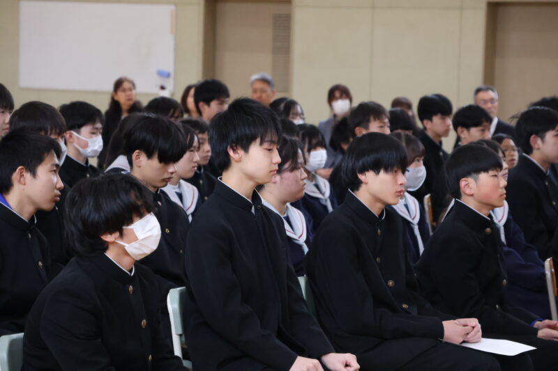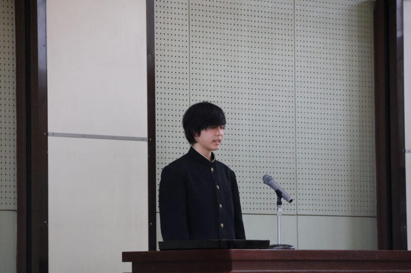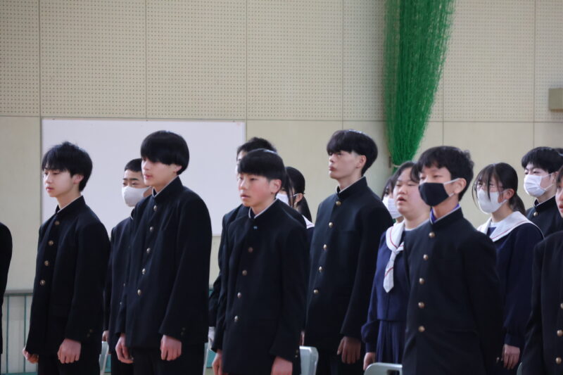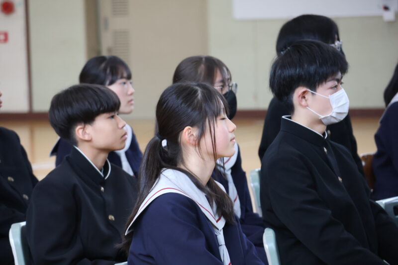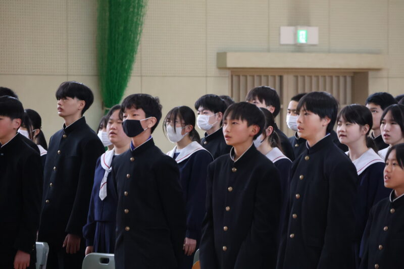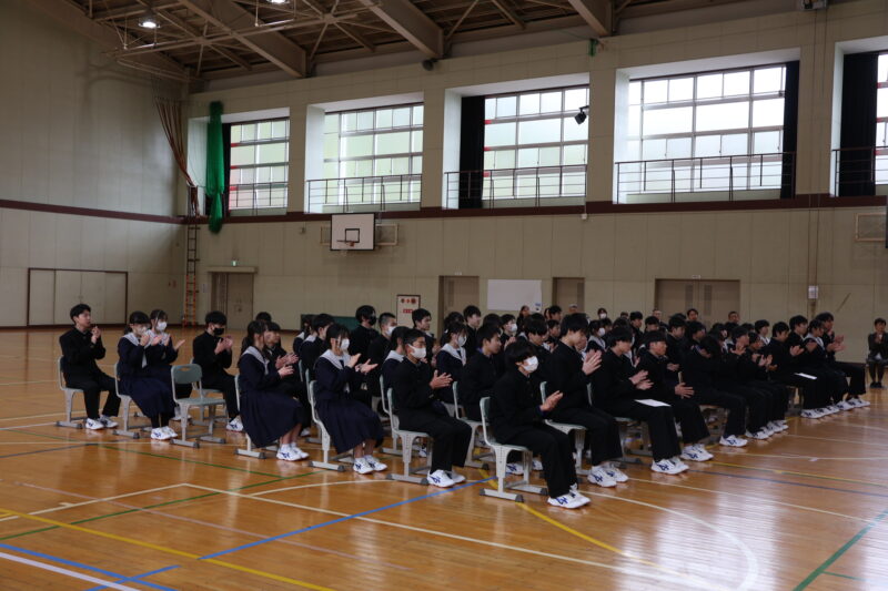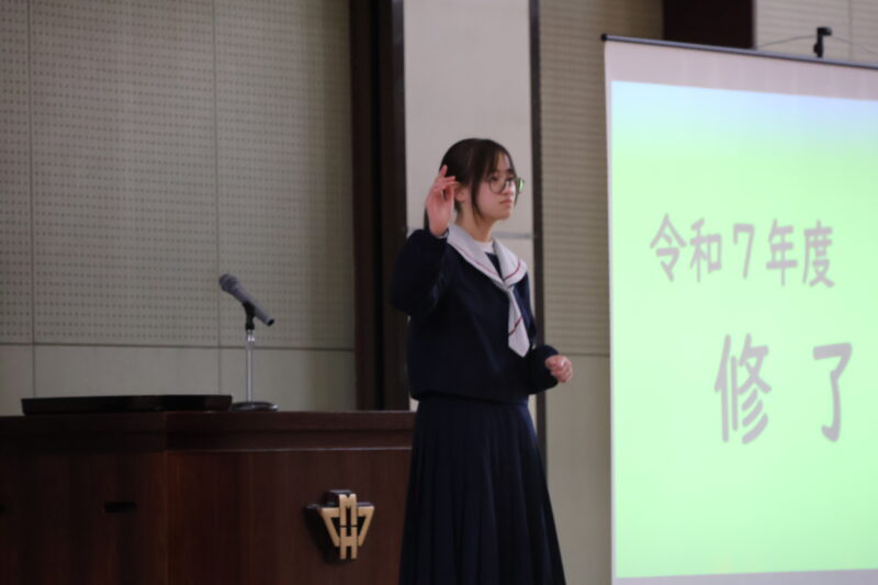 3月 26 2026 令和7年度 修了式 3月26日(木)、令和7年度修了式を行いました。 3年生がいなくなった体育館は、とってもこじんまりとしていましたが、凛とした空気の中、締めくくりの式を行うことができました。 学年代表への修了証授与。 生徒代表の話。2年生を代表して、3月で転校する藤田さんが、堂々と自分の思いを語りました。仲間のおかげで乗り越えられたこと、力をつけたことなど、自分をよく見つめ、成長が感じられる素晴らしい発表でした。 1・2年生全員、目標に向かって仲間と取り組んだ一年でした。卒級おめでとう!