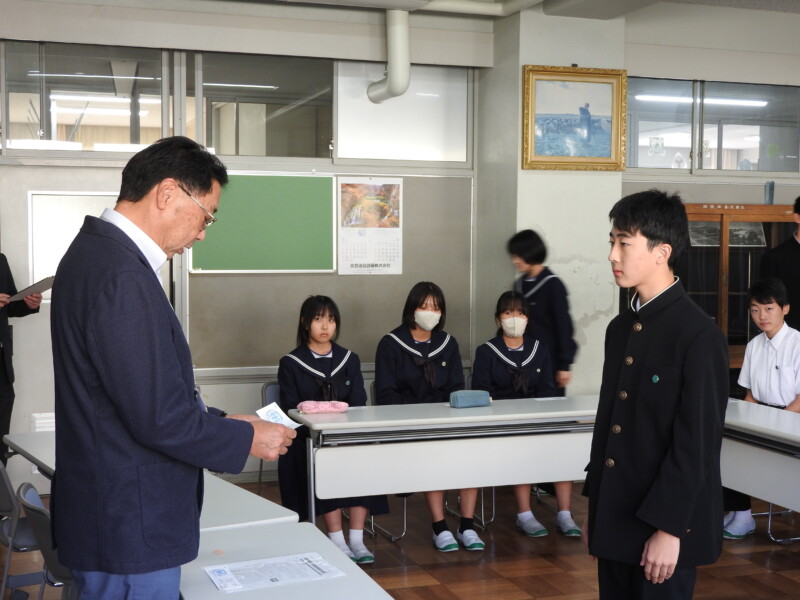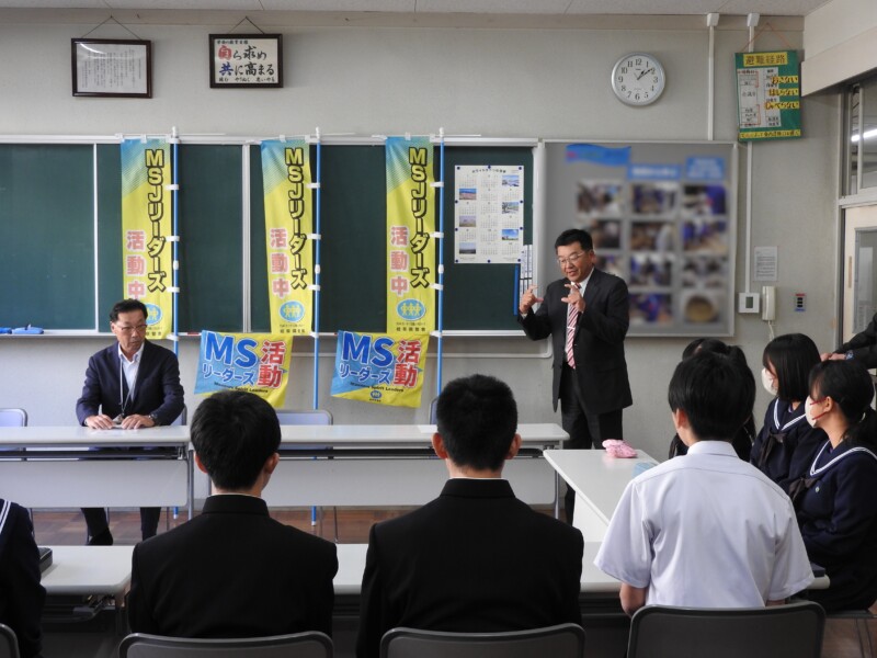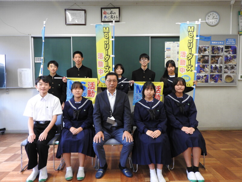 前期に引き続き、後期生徒会役員になった生徒が多治見警察署生活安全課の方からMSJリーダーズの証を交付していただきました。「MSJリーダーズ」とは、M(マナーズ)、S(スピリット)、J(ジュニア)リーダーズの略称で、「岐阜県の未来は君たちで」をキャッチフレーズに生徒自らが自発的に取り組む「生徒の生徒による生徒のための非行防止・規範意識啓発活動」を行っていきます。「あいさつ運動」や「地域清掃」など地域で生き生きする活動をさらに推進していきます。