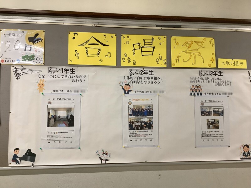 12月5日に予定されている合唱祭に向けて、練習や準備が進んでいます。図書館前には、各学年の練習状況が掲示されています。本番まで残り20日となりました。万全の状態で、本番を迎えられるよう、体調にも気を付けていきたいですね。