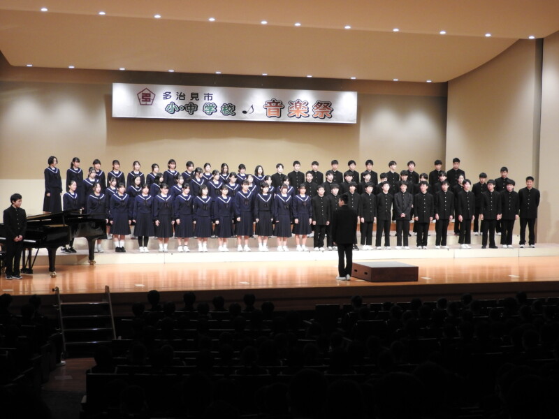 市の音楽祭があり、2年生が参加しました。学校の合唱祭からさらにレベルアップした「HEIWAの鐘」を披露してくれました。学校に帰ってきた生徒たちもやり切った表情を見せてくれました。講評には、「全員で一つになり『この曲を届ける』という気迫・集中力を感じた。ハーモニーが澄んでいて美しい。心を揺さぶられた。パワーがあり感激!(一部抜粋)」と書かれていました。多くの人の前で合唱を披露すること、ほかの中学校の合唱を聴くことが大きな刺激になったと思います。