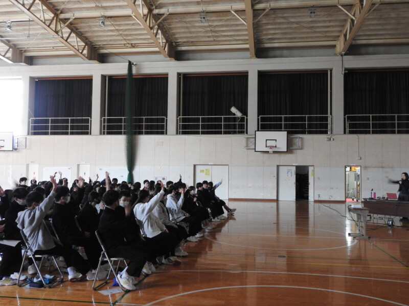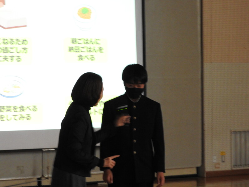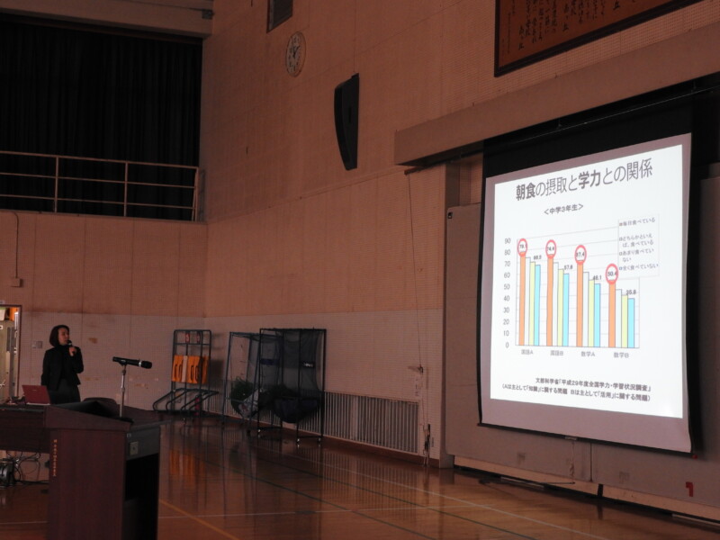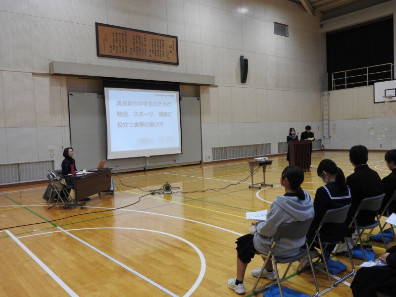 名古屋グランパスで食育アンバサダーをしていらっしゃる森裕子さんを講師にお招きして、「成長期の中学生のための勉強、スポーツ、健康に役立つ食事の選び方」についてクイズを入れながら楽しく教えていただきました。