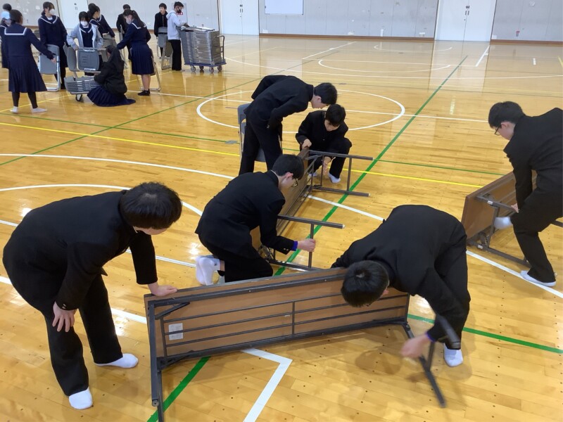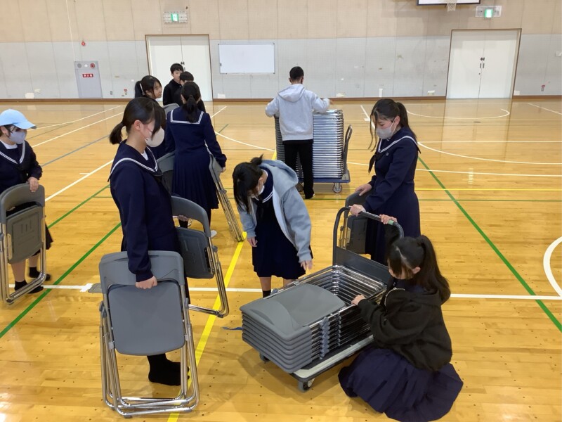 体育館の片づけボランティアを福祉委員長が呼びかけたところ、多くの生徒が朝早く登校して参加してくれました。朝からてきぱき活動してくれて大変助かりました。ありがとうございました。