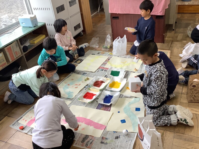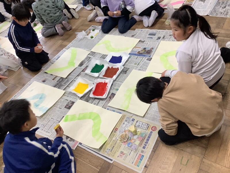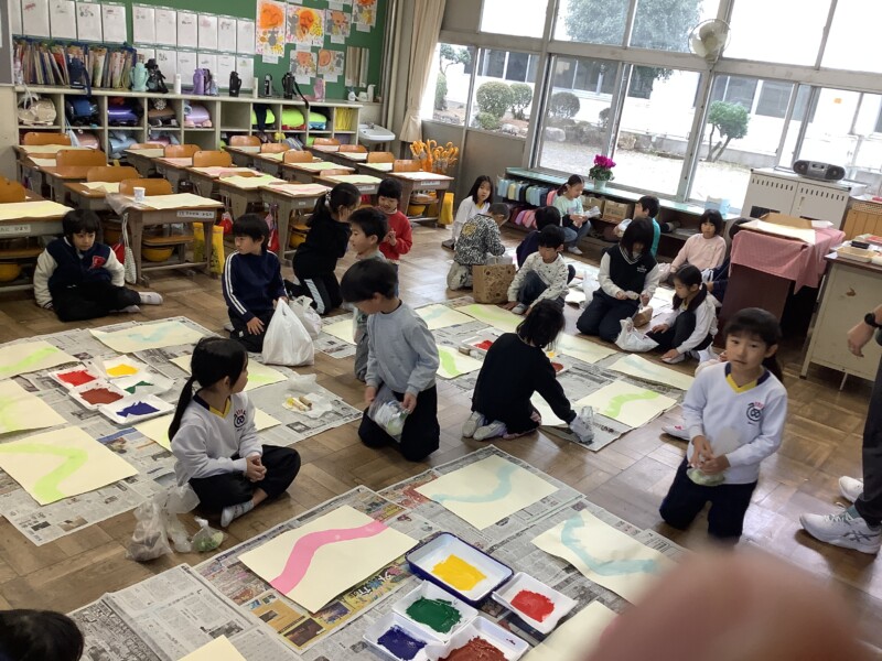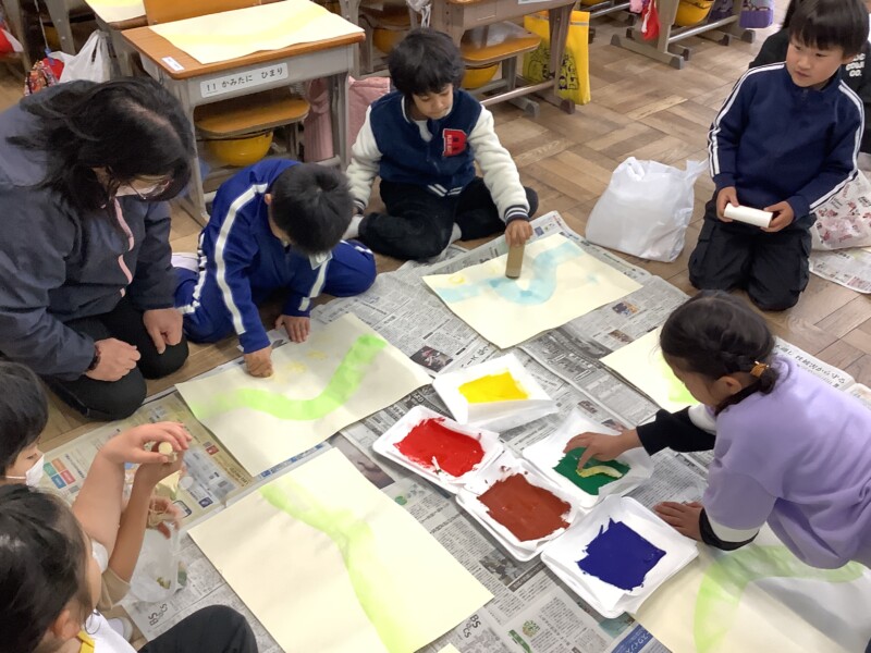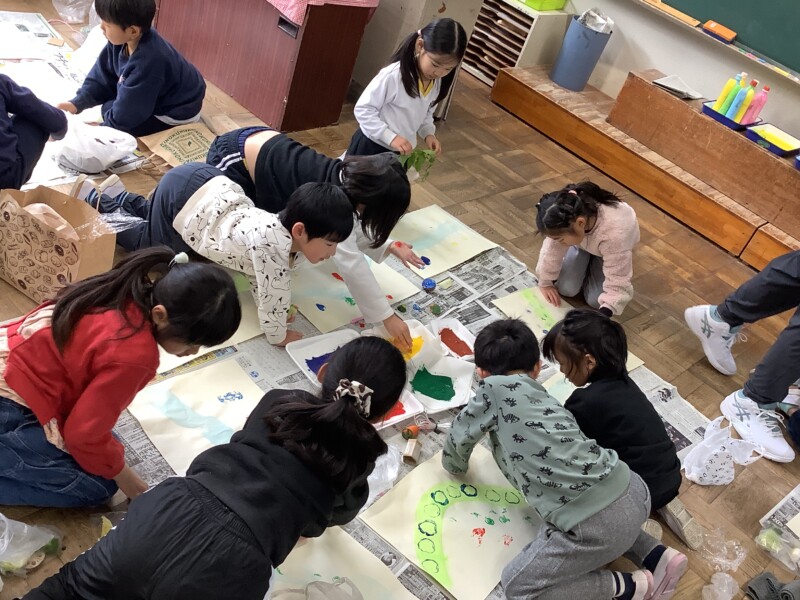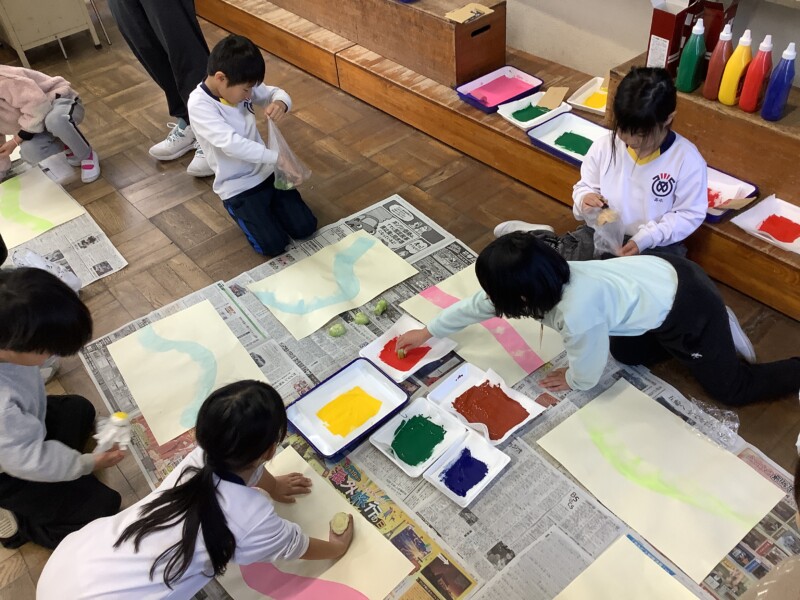 1年生が図工で「うつしたかたちから」を行いました。ローラーを使って模様をいれた後、家から持ってきた野菜の切れ端等を使って形をポンポン押していきました。面白い形や意外な形が表れてびっくりしたり、感嘆の声をあげたり…。