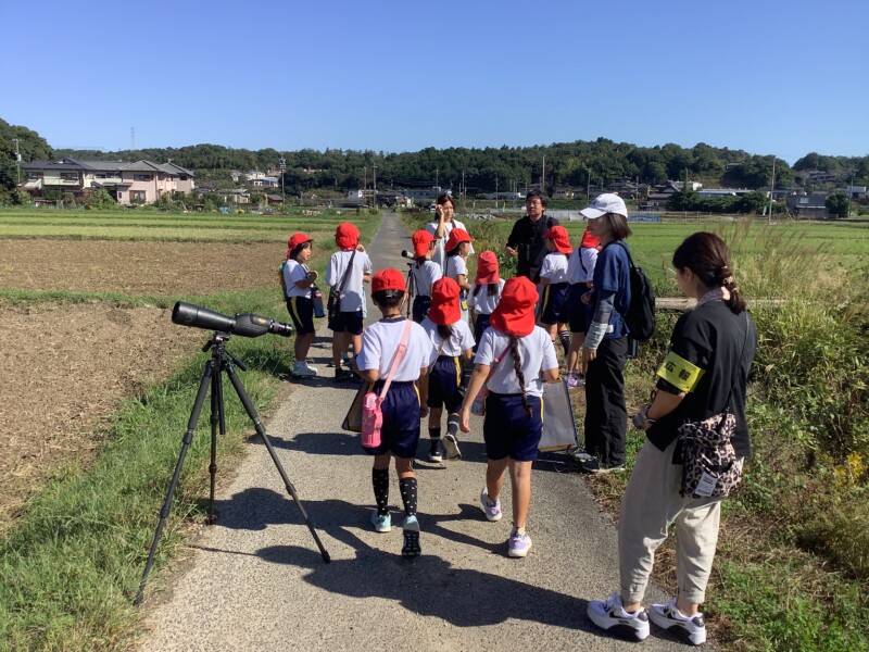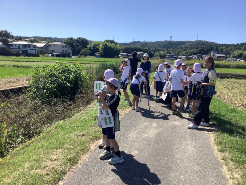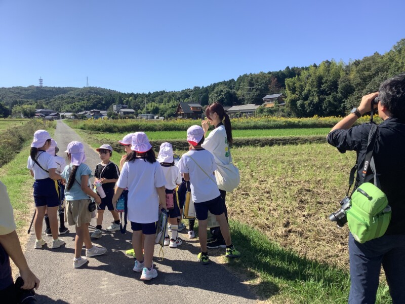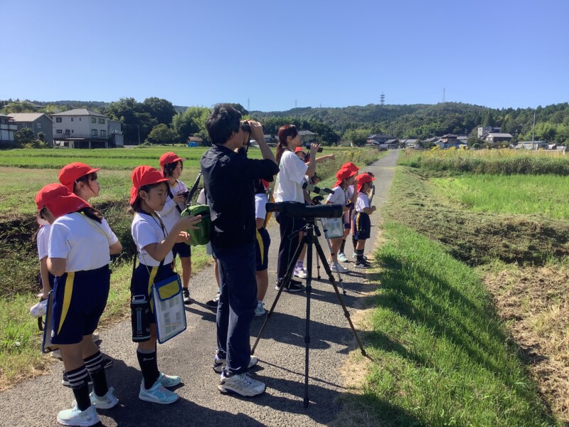 10月 17 2025 探鳥探検〈3年生〉 南姫小学校の3年生は郊外へ出かけ、「南姫にすむ鳥」を探しました。この日は久しぶりの晴れ間で地域の方の草刈り機が活発に動いており、鳥はその音を嫌がっていたのかもしれません。また、鳥たちは早朝に活発に動くため、多くは休んでいたのかもしれません。見つけた鳥の数は多くはなかったのですが、講師の先生の助けで望遠鏡越しに美しいモズの姿を観察できました。子ども達はメモを取り、望遠鏡をのぞきながら、鳥の生活を学ぶ貴重な体験をしました。今後も南姫の自然に親しむ活動を大切にしていきます。