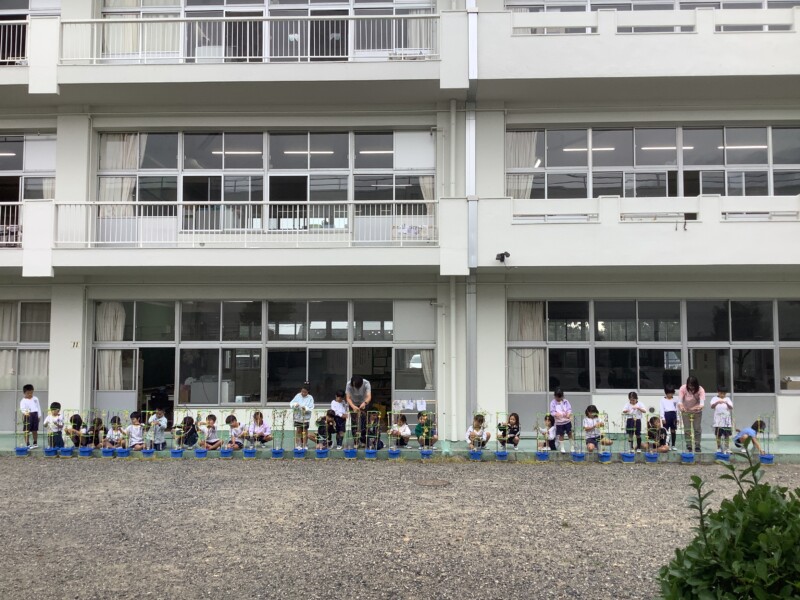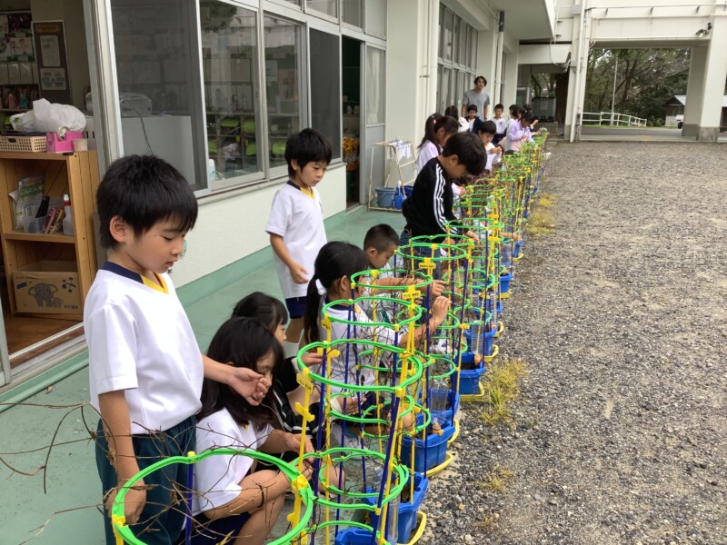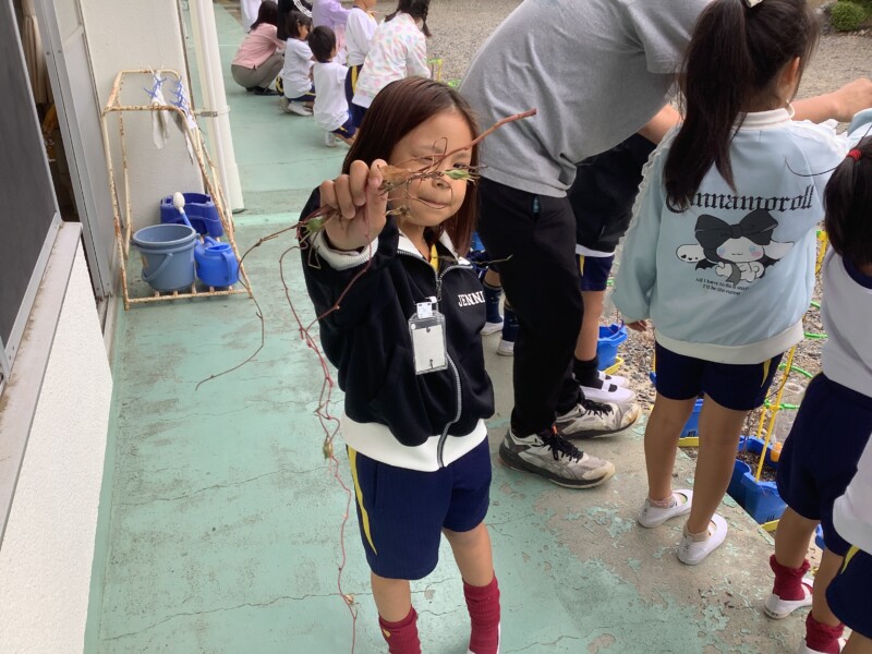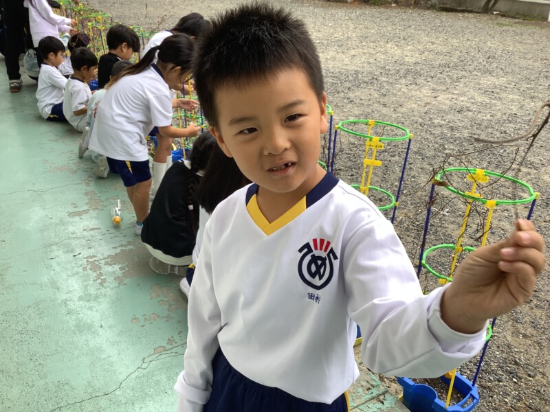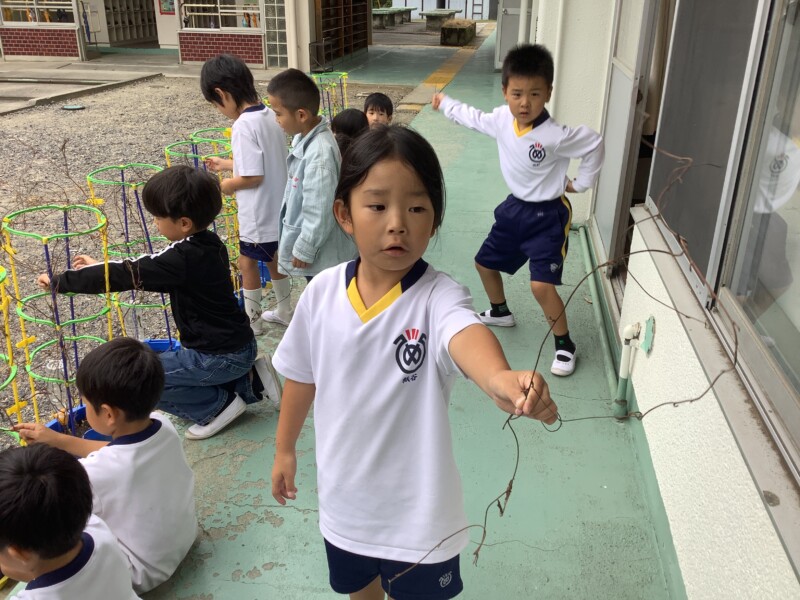 夏の間、元気に花を咲かせていた朝顔もすっかり咲き終わり、今日はそのつるを収穫します。子どもたちは、絡みついたつるを切らないように、そっと丁寧にほぐしながら大事に扱っていました。