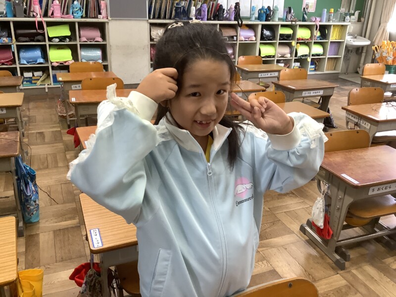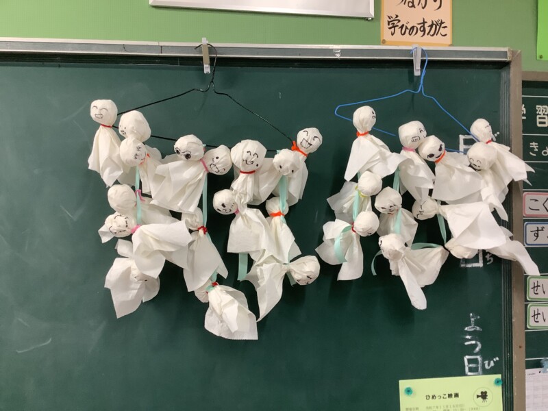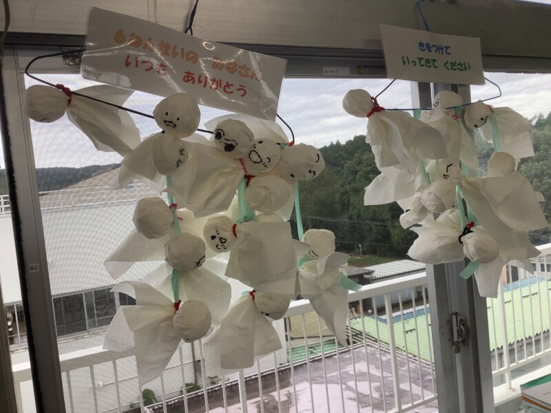 ふと教室をのぞくと、黒板にはかわいいテルテル坊主がゆらゆら。いつも優しく接してくれる6年生が修学旅行に出かけるので、感謝の気持ちをこめてプレゼントするのだそうです。