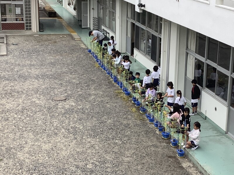 南姫小学校の中庭では、1年生が生活科の学習でリースづくりの準備をしていました。