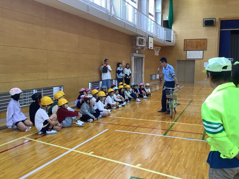 3年生の子ども達が貸してくれた11台の自転車を大切に乗り継ぎながら、横断歩道の渡り方、乗るときに気をつけること、ヘルメットの正しいかぶり方などを、実際の自転車を使い、警察の方から丁寧に教えていただきました。
