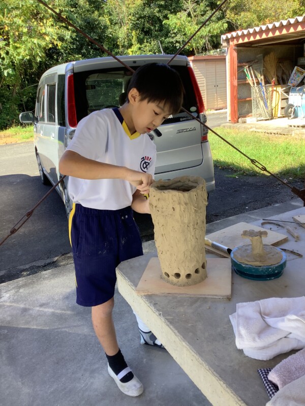 子どもたちは粘土を板状に伸ばし底をつくり、紐状に伸ばした粘土で壁を積み重ねていきました。最後に穴をあけたり、模様をつけたりして、下書きなしでその場で工夫しながら、自分だけのフラワーポットづくりにチャレンジしました。