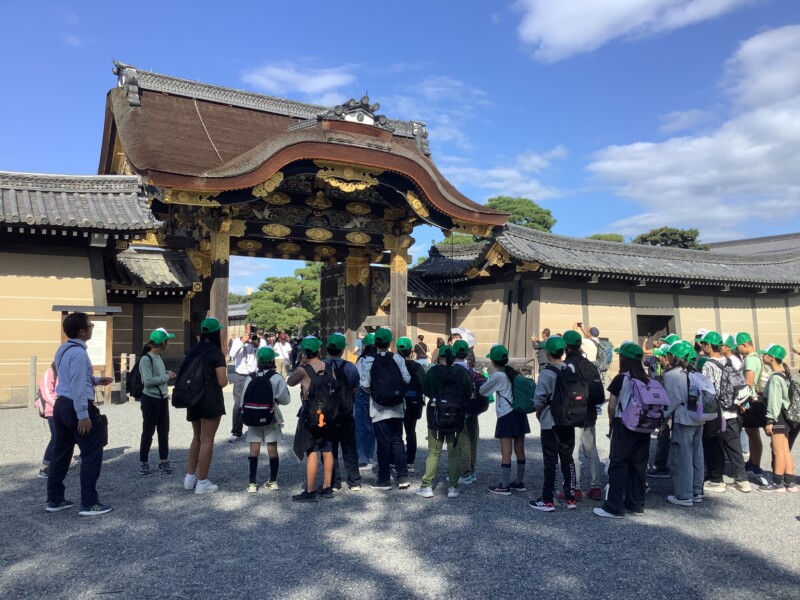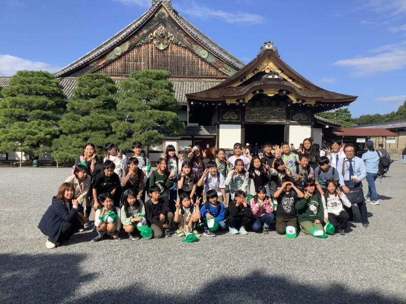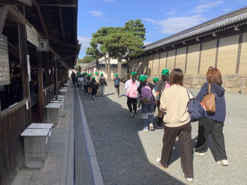 10月 24 2025 修学旅行2日目 二条城〈6年生〉 タクシー研修から帰ってきたグループから、昼食を食べ、二条城を散策する予定でしたが、なんと、なんと、到着時間がほぼ一緒という奇跡が起きたため、二条城の散策はクラス合同で行く事になりました。確かにキュキュッとなる、ウグイス張りの床に感動した時間でした。