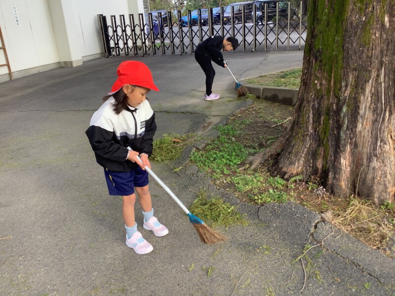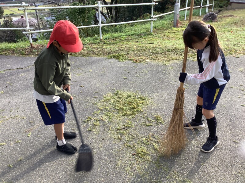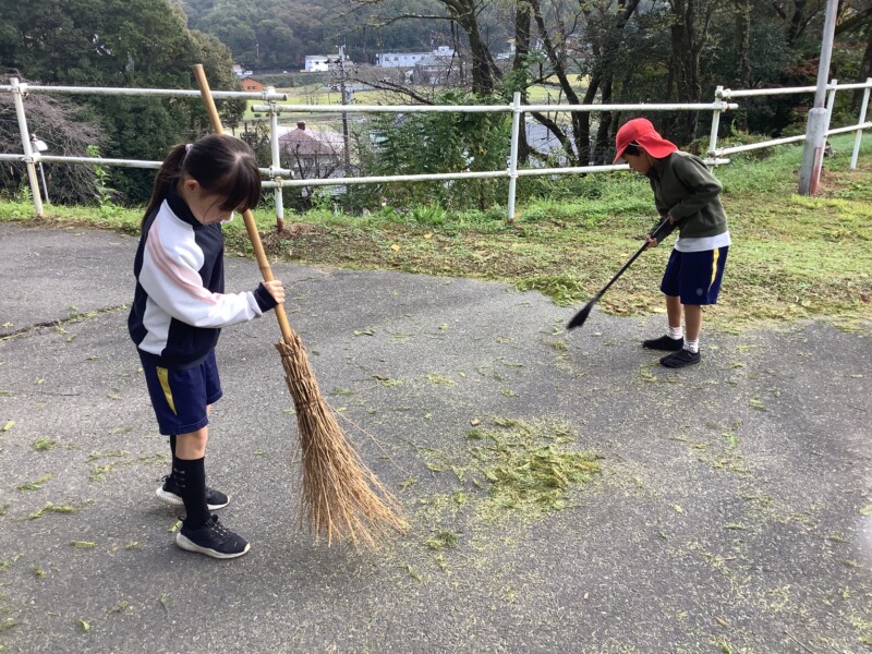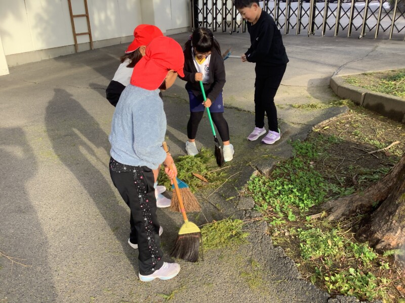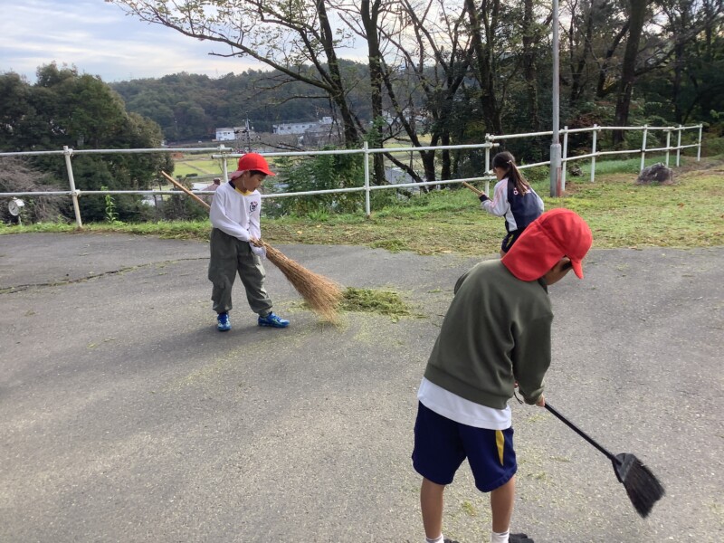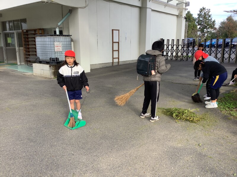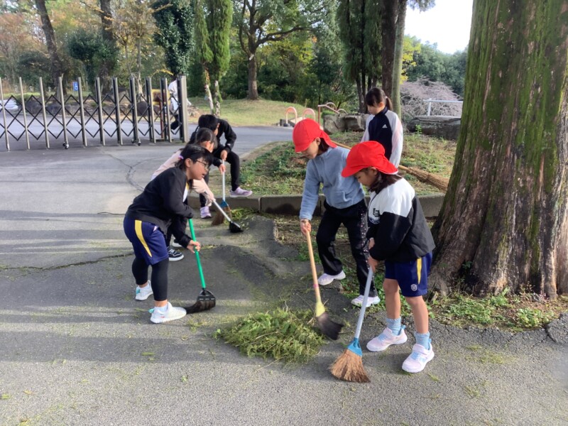 11月 11 2025 やさしさ広がる秋のひととき②〈全校〉 朝の玄関前では、11日(火)も落ち葉掃除をしてくれる子ども達の姿が見られました。今回は、低学年の子を中心に、たくさんの子が集まってきて、元気いっぱいに掃いてくれました。「これ、校長先生が一人でやってたら大変だよね!」と話しながら、みんなで力を合わせます。朝の時間いっぱい、ほうきを動かし続ける姿は本当に頼もしいものでした。「手が冷たくて固まった~」と笑いながらも、最後まで気持ちよく掃除をしてくれた子ども達。その優しい気持ちに、校庭の落ち葉もどこかうれしそうに揺れていました。