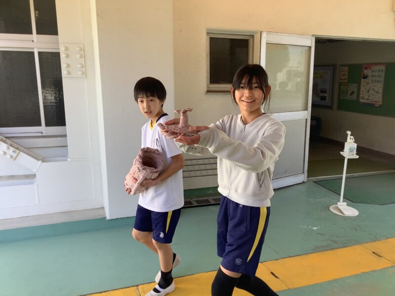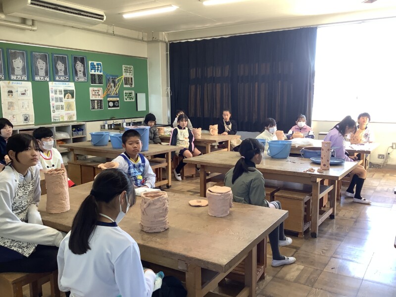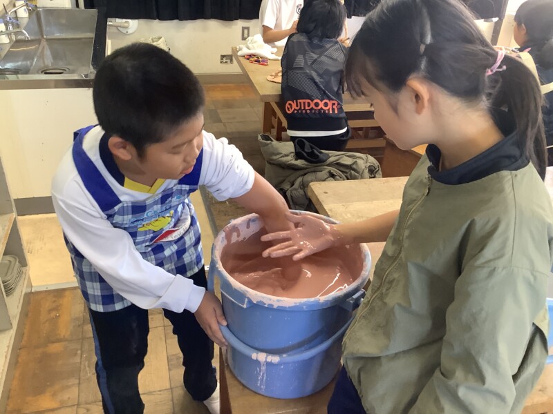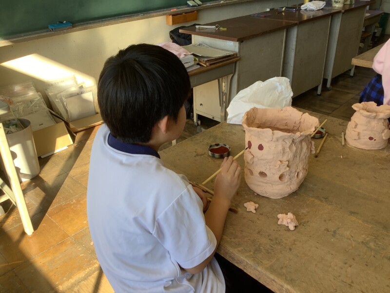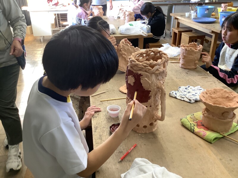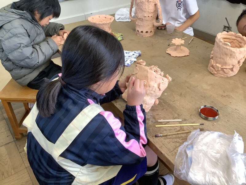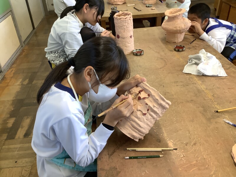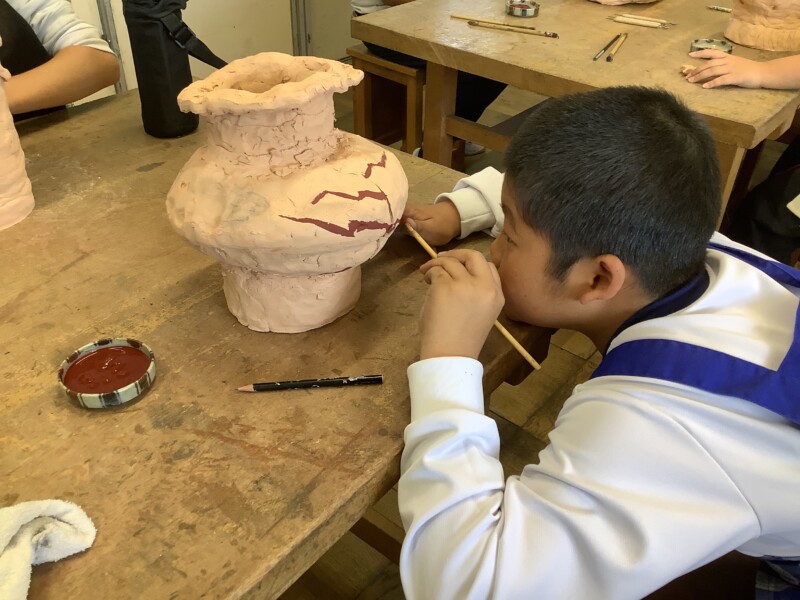 11月 20 2025 作品に釉薬を付けました〈5年生〉 5年生は、地域の陶芸の先生をお招きして、作品に釉薬をつける体験をしました。自分の思い描いたイメージに合わせて、丁寧に釉薬をつけていきます。釉薬をつけた部分が焼くと黒く変化することを教わり、子どもたちは「どんな色になるかな?」とわくわくした様子でした。地域の方の温かいご指導を受けながら、世界に一つだけの作品づくりに取り組む姿が印象的でした。焼き上がりが待ち遠しいです。