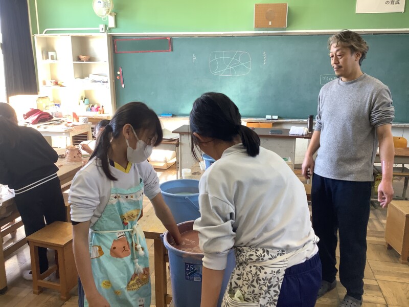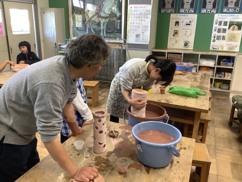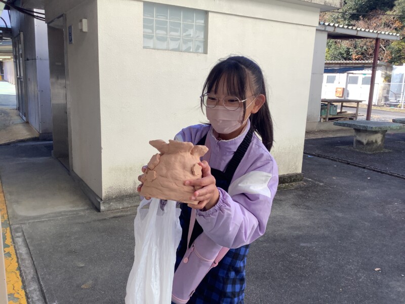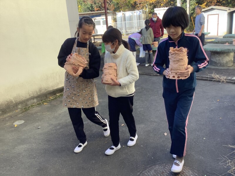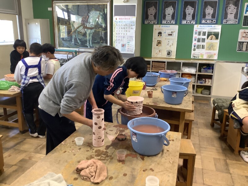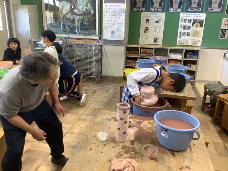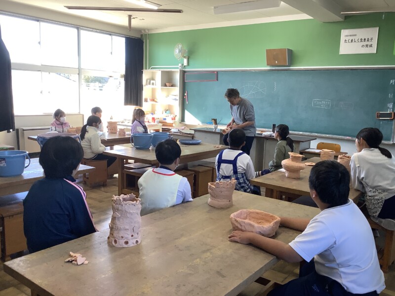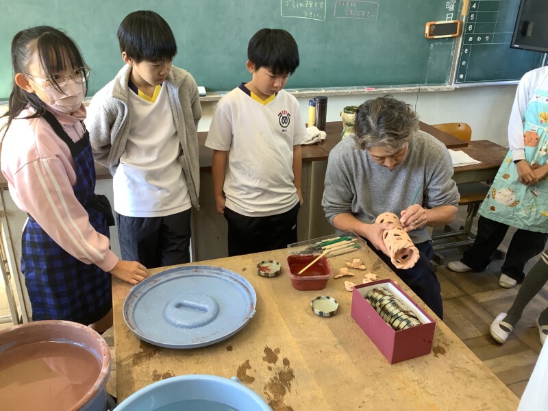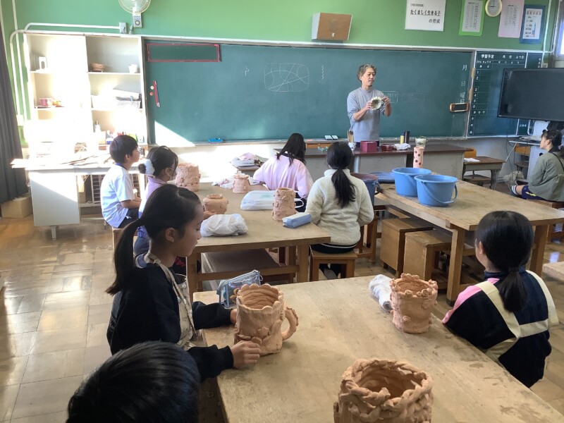 11月 20 2025 作品に釉薬を付けました〈5年生〉 5年生は、地域の陶芸の先生をお招きして、作品に釉薬をつける体験をしました。自分の思い描いたイメージに合わせて、丁寧に釉薬をつけていきます。釉薬をつけた部分が焼くと黒く変化することを教わり、子どもたちは「どんな色になるかな?」とわくわくした様子でした。地域の方の温かいご指導を受けながら、世界に一つだけの作品づくりに取り組む姿が印象的でした。焼き上がりが待ち遠しいです。