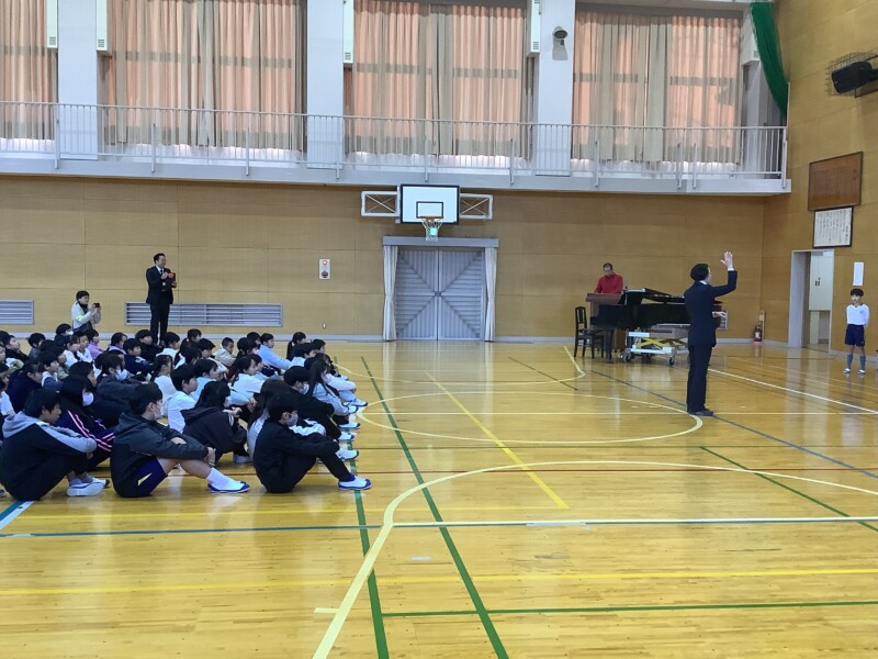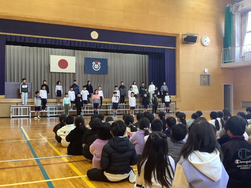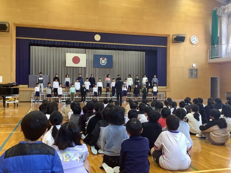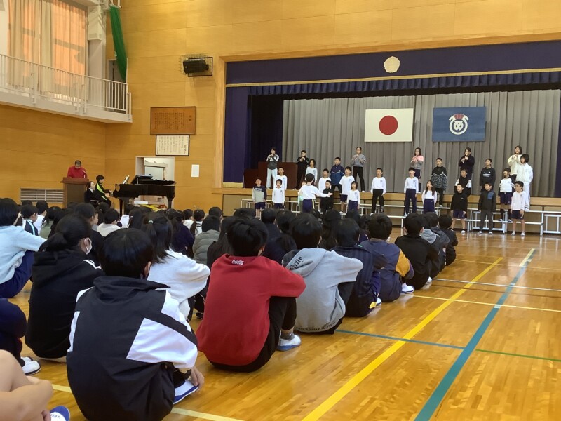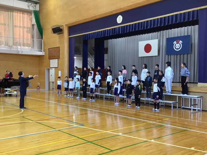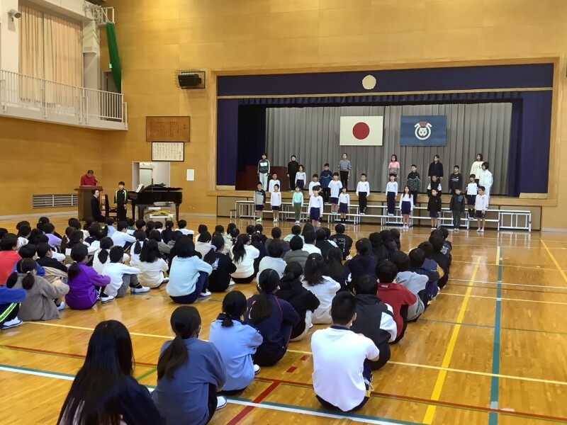 12月 04 2025 心をひとつに ―全校への合唱発表―〈4年生〉 4年生は、11日の音楽祭に向けて練習してきた「あんたがたどこさ」と「風のメロディー」の2曲を、体育館で披露しました。朝の冷たい空気もあり、 はじめは少し緊張した様子もありましたが、歌い始めるとみんなの声がひとつになり、温かく響きました。透明感のある歌声ときれいなハーモニーに、聴いていた先生や友達からは「すてきだったね」「きれいな声だね」と感想が寄せられ、体育館はやさしい拍手に包まれました。 音楽祭まではもう少し時間があります。今日の経験を胸に、さらに心をこめた歌を目指していく4年生です。