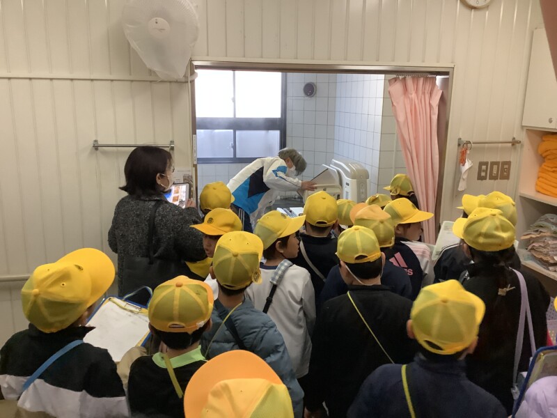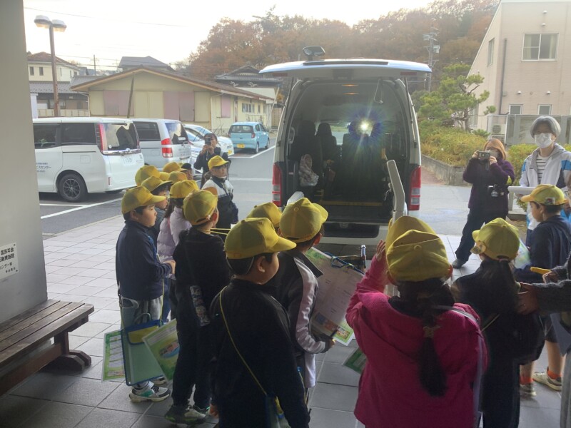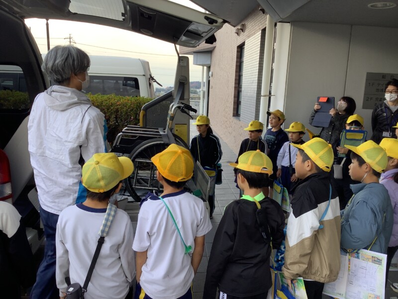 館内では、車いすを乗せることができる自動車や、自動でお湯につかることができるお風呂など、初めて見る設備がたくさんあり、「すごい!」という声があふれていました。また、見学の途中では、南姫老人福祉センターの利用者の皆さんが笑顔で手を振ってくださり、子どもたちは温かい地域のつながりを感じていました。