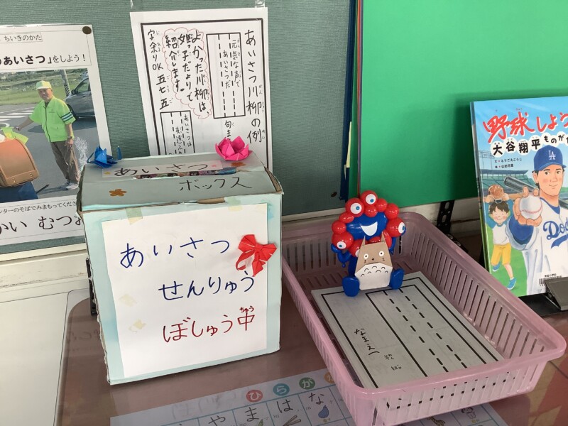 校長室の外に応募用紙とポストを設置しています。あいさつの輪がもっと広がるように、よかったら皆様もぜひ参加してみませんか?(素敵なアイデアをお子さんに託してください。)