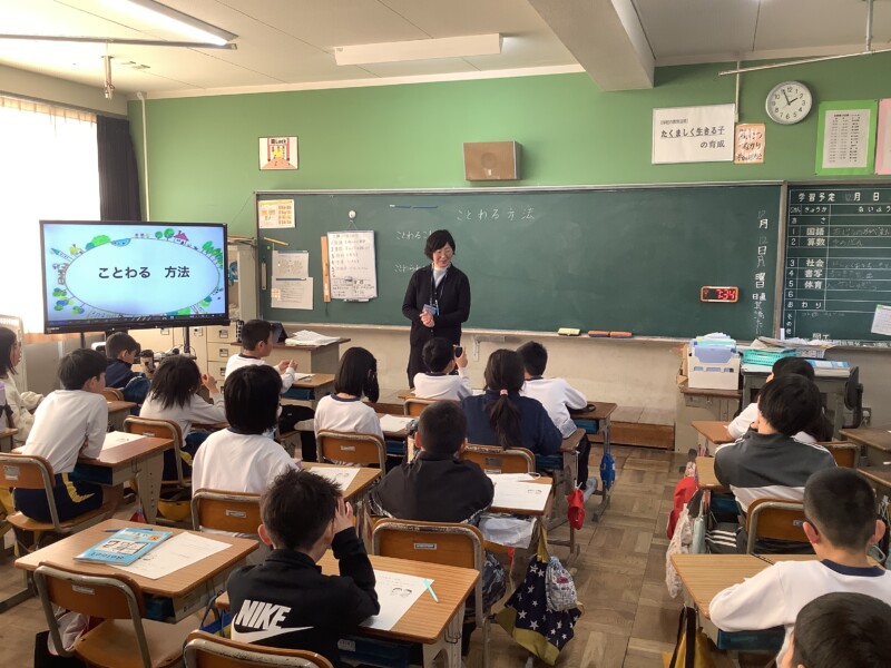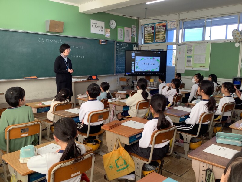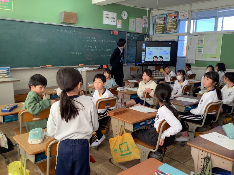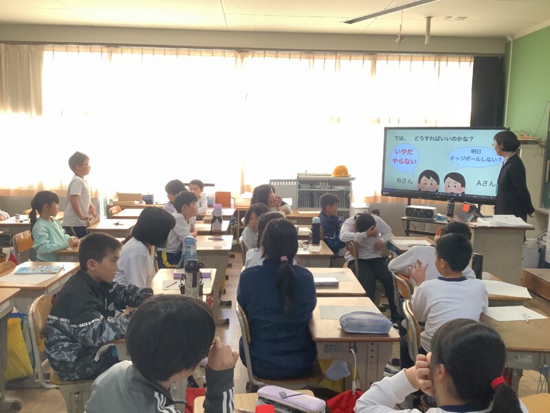 12月 16 2025 スクールカウンセラーの先生の授業〈3・4年生〉 3・4年生が、スクールカウンセラーの先生と一緒に「ことわる方法」について学びました。授業の中では、友達にドッジボールに誘われたときの場面をもとに、「明日は家族とお出かけするから遊べないんだ。でも、その次の日なら遊べるよ。」等と、自分の気持ちを正直に、やさしく伝える方法を考えました。「ことわる」ことも「ことわられる」ことも、相手が嫌いだからではなく、おたがいを思いやる気持ちがあるからこそ大切にしたいこと。友達の心を大事にするあたたかな言葉が、教室いっぱいに広がっていました。