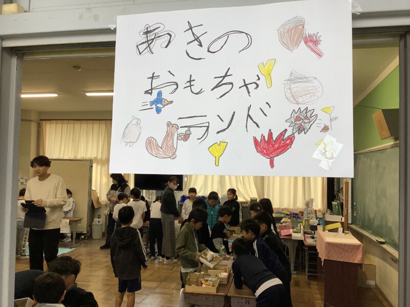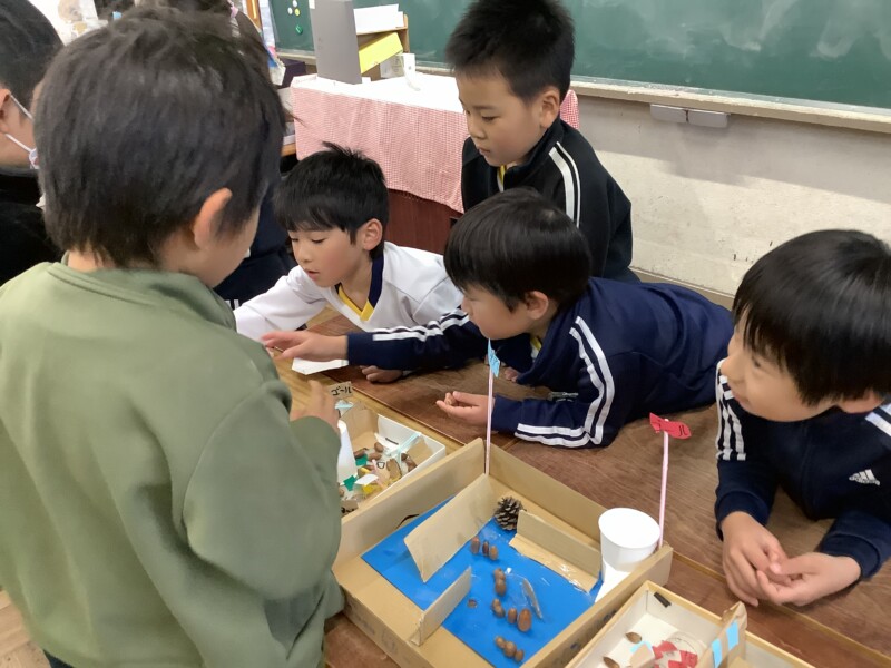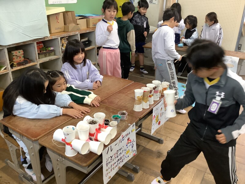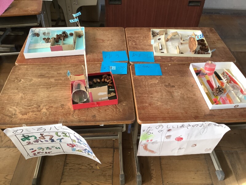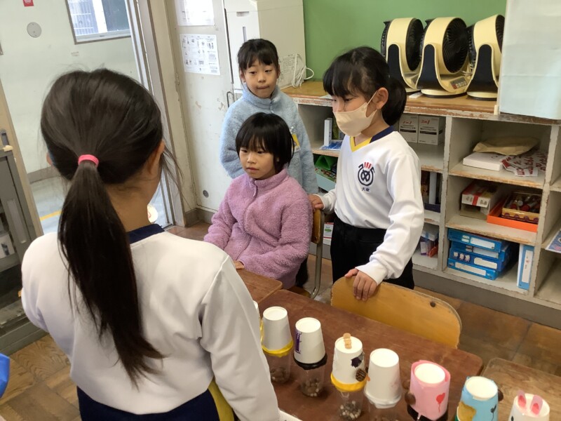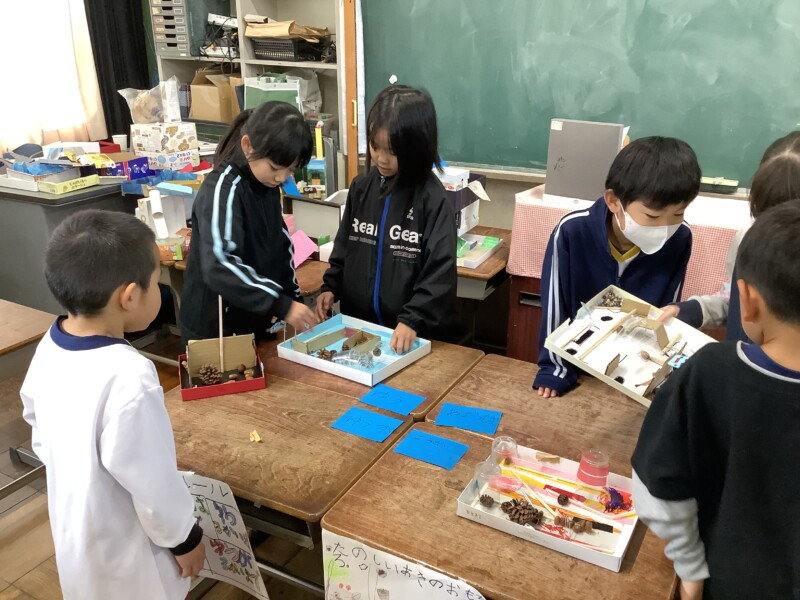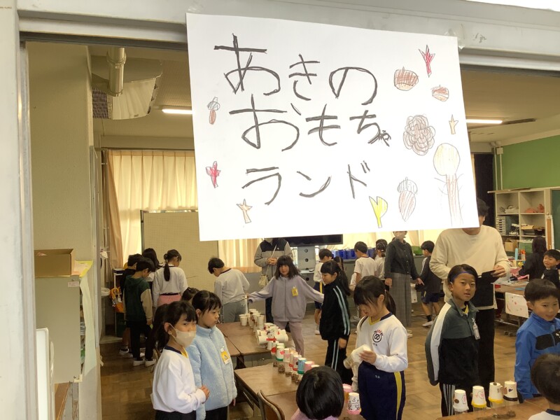12月 17 2025 《2年生対象》力作おもちゃが大集合! あきのおもちゃランドへようこそ①〈1年生〉 1年生が心をこめて準備してきた「あきのおもちゃランド」を開催しました。 1時間目には、けん玉や迷路、魚つりなど、手づくりのとっておきのおもちゃをそろえて、2年生のみんなを招待しました。どのお店も大にぎわいで、「楽しい!」という声がたくさん聞こえました。おもちゃで遊ぶだけでなく、「どうぞ」「ありがとう」の声が行き交い、みんなの笑顔が広がったひとときでした。2年生に楽しんでもらえて、1年生も誇らしげでした。