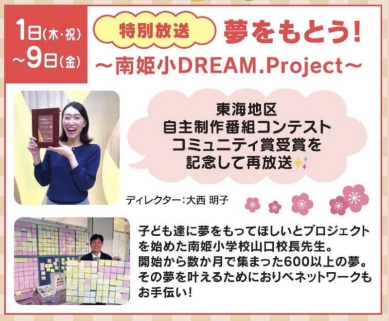 12月 31 2025 特別再放送決定!「夢をもとう!~南姫小DREAM.Project~」〈南姫小DREAM.Project〉 とてもうれしいお知らせです!昨年度末に、南姫小学校の取組を紹介していただいた、おりべネットワークさん制作の番組「夢をもとう!~南姫小DREAM.Project~」が、「東海地区自主制作番組コンテスト」において、コミュニティ賞を受賞されました。心よりお祝い申し上げます。 この受賞を記念して、おりべ12chにて、1月1日から9日の期間限定で、特別に再放送されます。子どもたちが夢に向かって頑張る姿がたくさん紹介されています。保護者の皆様、地域の皆様、ぜひご覧ください。