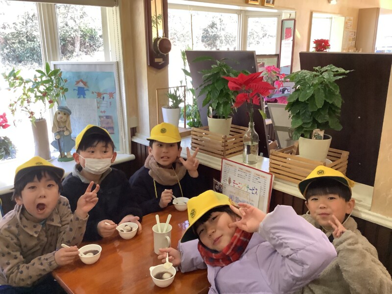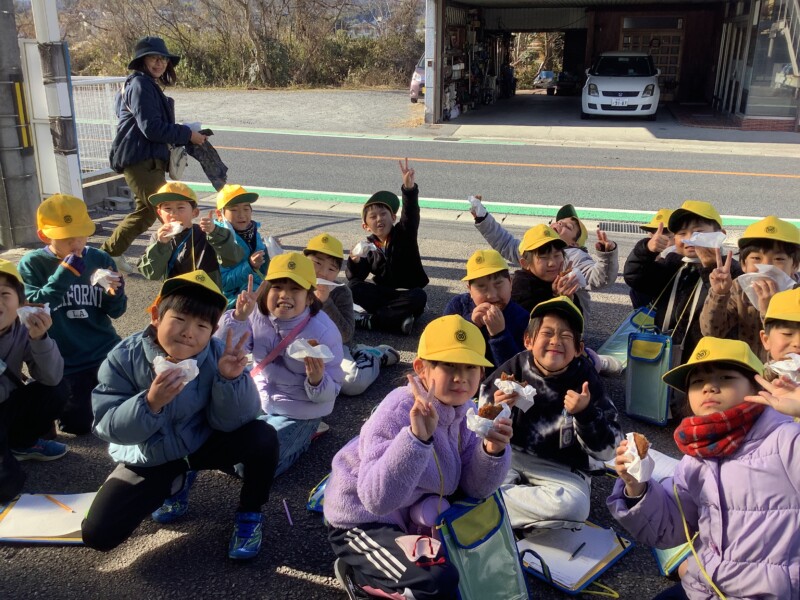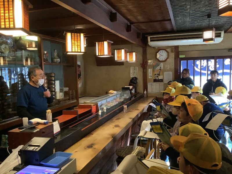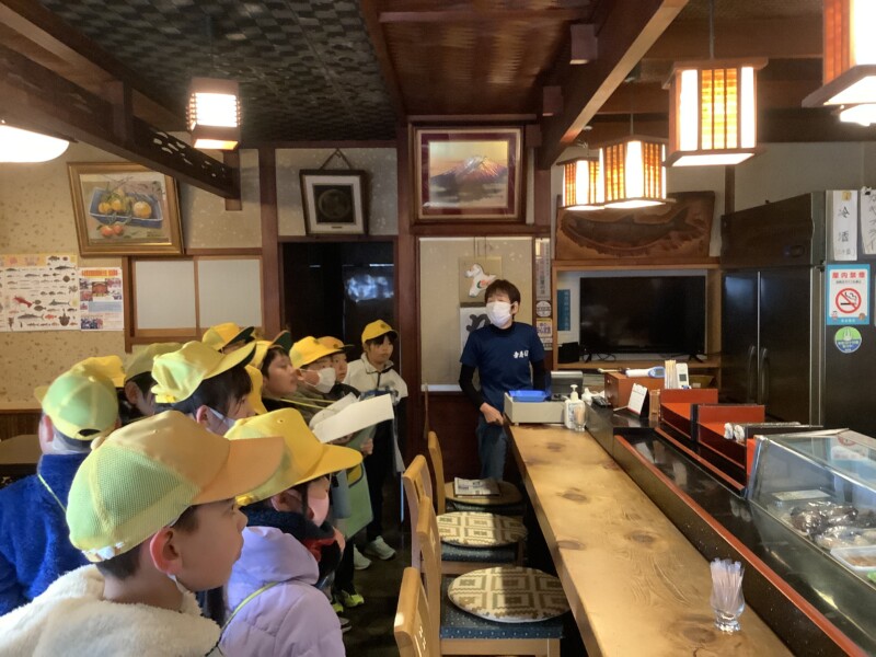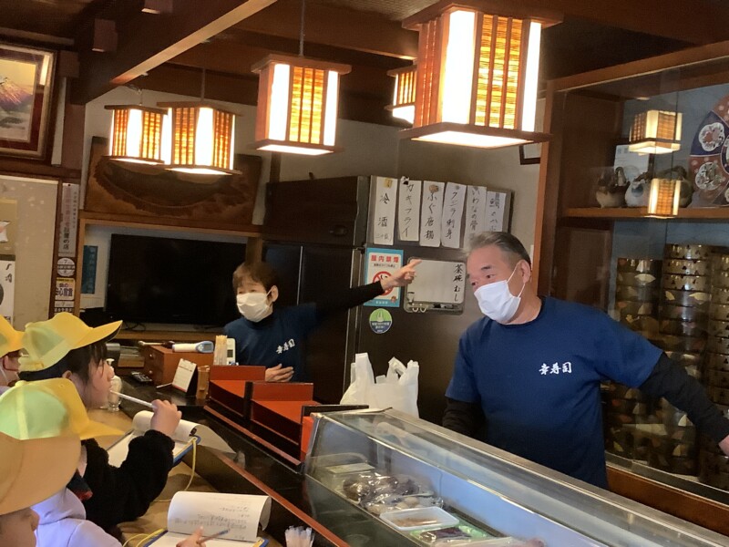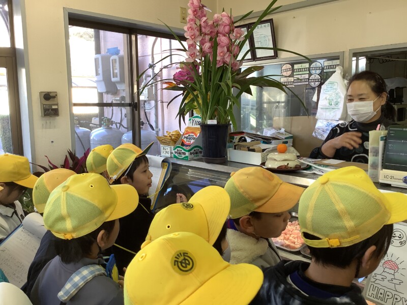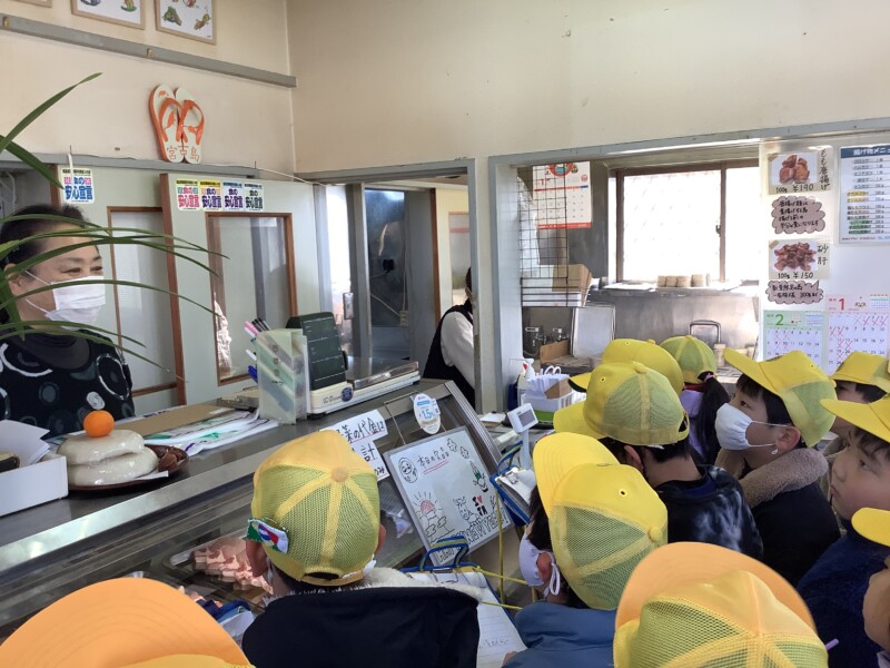 2年生が町探検で、地域のお店「蓑むし」さん、「幸寿司」さん、「宮嶋精肉店」さんを訪れました。