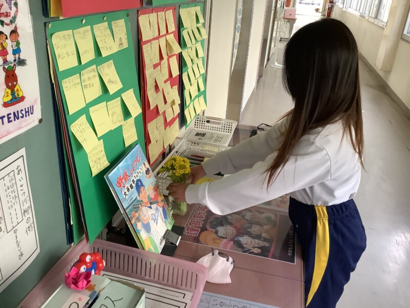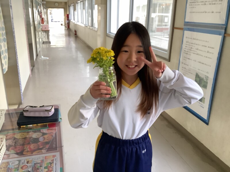 1月 15 2026 菜の花を飾っていいですか?〈みやま2組〉 大切に育ててきた菜の花が、きれいに咲きました。中心となって育ててくれた子が「ぜひ飾ってください」と校長室まで花を届けてくれました。花瓶に生けた菜の花は、毎日水を替えたり花を入れ替えたりと、大切にお世話してくれています。廊下がぱっと明るくなるような黄色の花が、子どもたちの心の温かさを伝えてくれています。