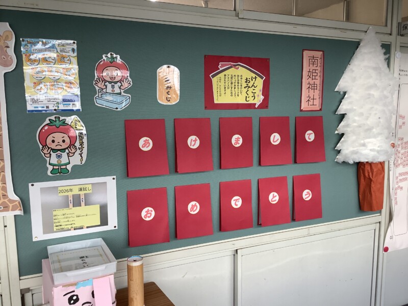 1月 15 2026 大吉が出ると…〈保健室の取組〉 1月、保健室の前に「南姫神社」が登場しました。掲示には「けんこうおみくじ」として、たくさんの健康のヒントが書かれています。おみくじを引いて大吉が出た子には、ひめトマちゃんのシールのプレゼントも!立ち止まって掲示を見たり、楽しそうにおみくじを引いたりする子どもたちの姿が見られ、冬の寒さの中にも笑顔と元気が広がっています