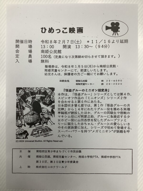 日時は、2月7日(土)13時より受付開始、13時30分開演(上映時間94分)、会場は南姫公民館です。上映作品は、子どもたちに人気の「怪盗グルーのミニオン超変身」です。