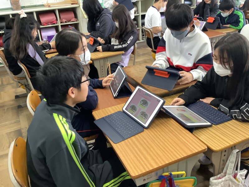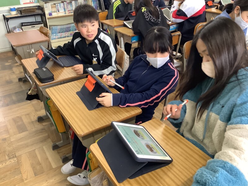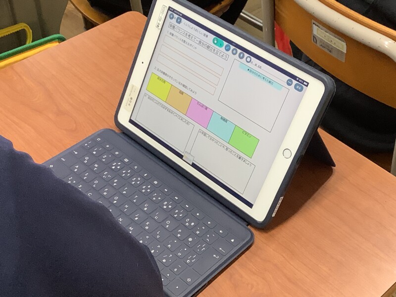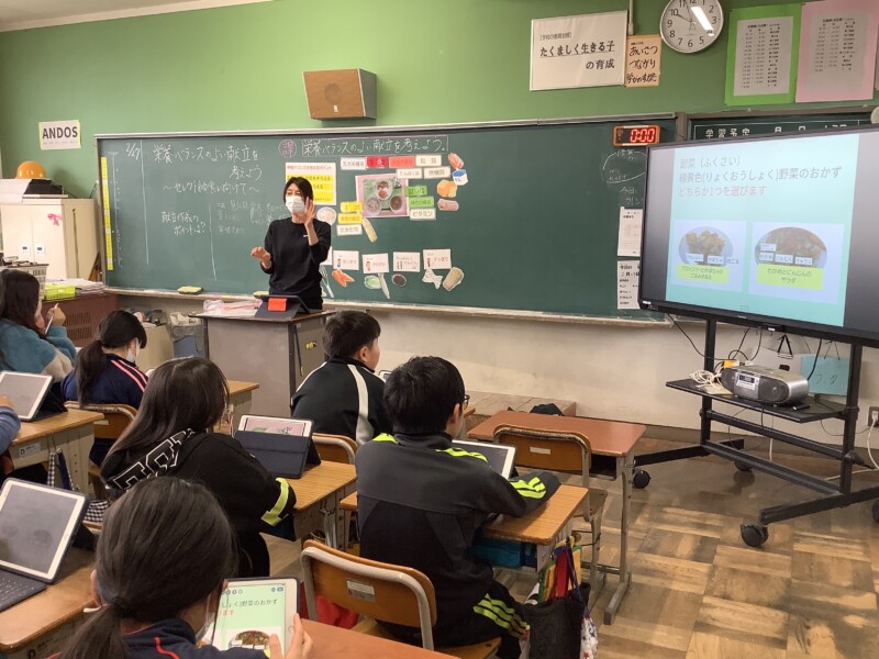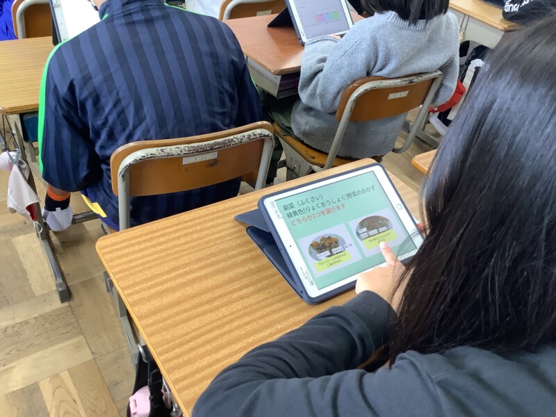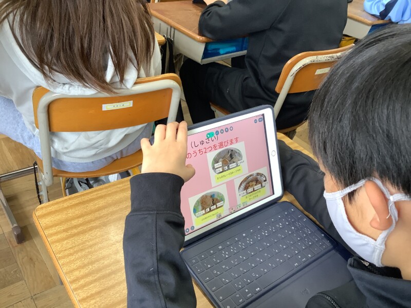 今日はセレクト給食を計画する日。自分たちで計画を立て、おかずを4品の中から選ぶことができます。ただ好きなものを選ぶだけではなく、栄養のバランスや食べ物の効果についても考えながら選択していました。