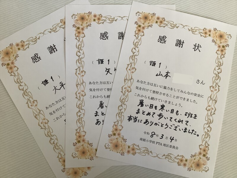 3月4日(水)の5時間目に、全校で「第3回なかよし分団会」が行われました。地区委員の保護者の皆さんにもご参加いただき、1年間の登下校をふり返りながら、安全に登校できたことへの感謝の気持ちを共有しました。これまで班をまとめてくれた後期通学班長・副班長へ感謝状が贈られ、新しい班長・副班長の紹介も行いました。通学時の並び方の確認や、新1年生への手紙づくりなど、次年度へ向けた準備を整えました。みんなで安全を守り合う大切さを再確認する、温かな時間となりました。