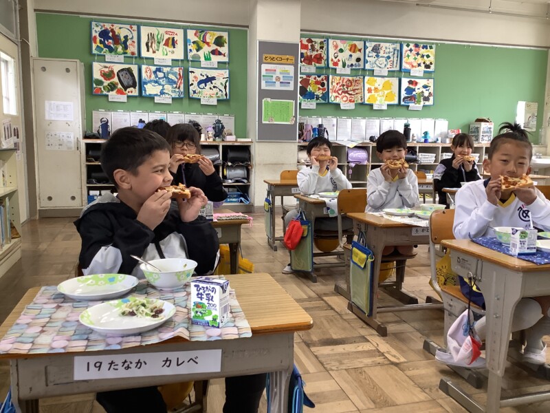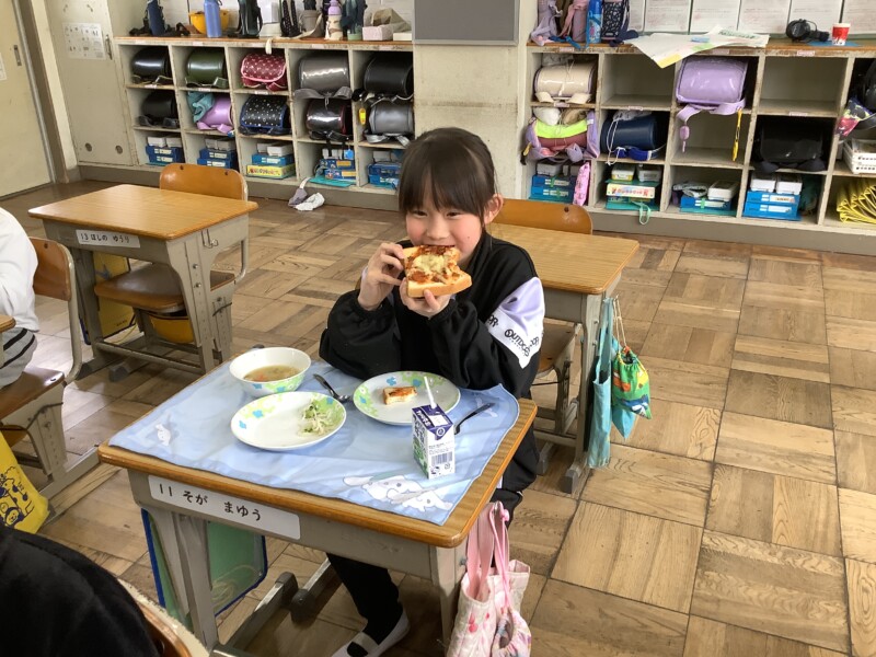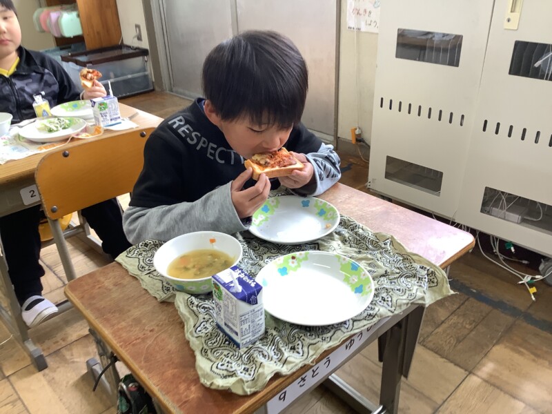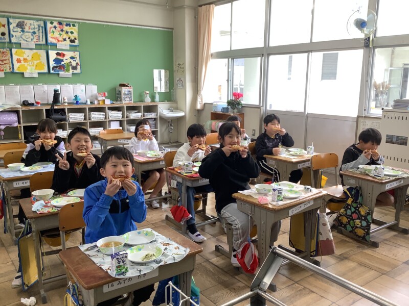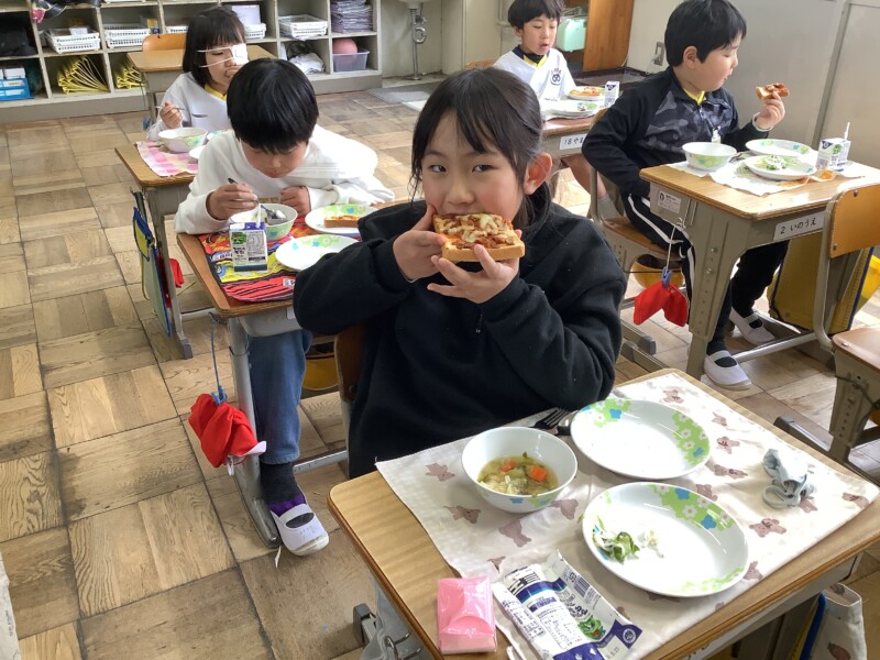 3月 13 2026 給食にピザトーストが!〈2年生〉 今日の給食はピザトーストでした。これは、1年間に1回 出るかでないか の 珍しいメニュー です。おかわりをしたい児童もたくさんいて、おかわりじゃんけんで盛り上がりました。 おいしそうに食べる2年生の子ども達の様子をぜひご覧ください。