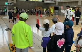 2時間目に一年生から三年生、3時間目に四年生から六年生の交通安全教室が行われました。あいにくの天候のため、体育館で横断歩道の渡り方の練習でした。